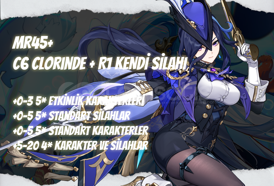 Bu ilanı satın aldığınızda MR45+ seviyesinde içerişinde C6 Clorinde + R1 kendi silahı bulunan bir hesap tarafınıza iletilecektir.Hesapların içerişinde 0-3 adet 5* etkinlik karakter içerebilir.Hesapların içerişinde 0-5 adet 5* standart karakter içerebilir.Hesapların içerişinde 0-5 adet 5* standart silahı içerebilir....