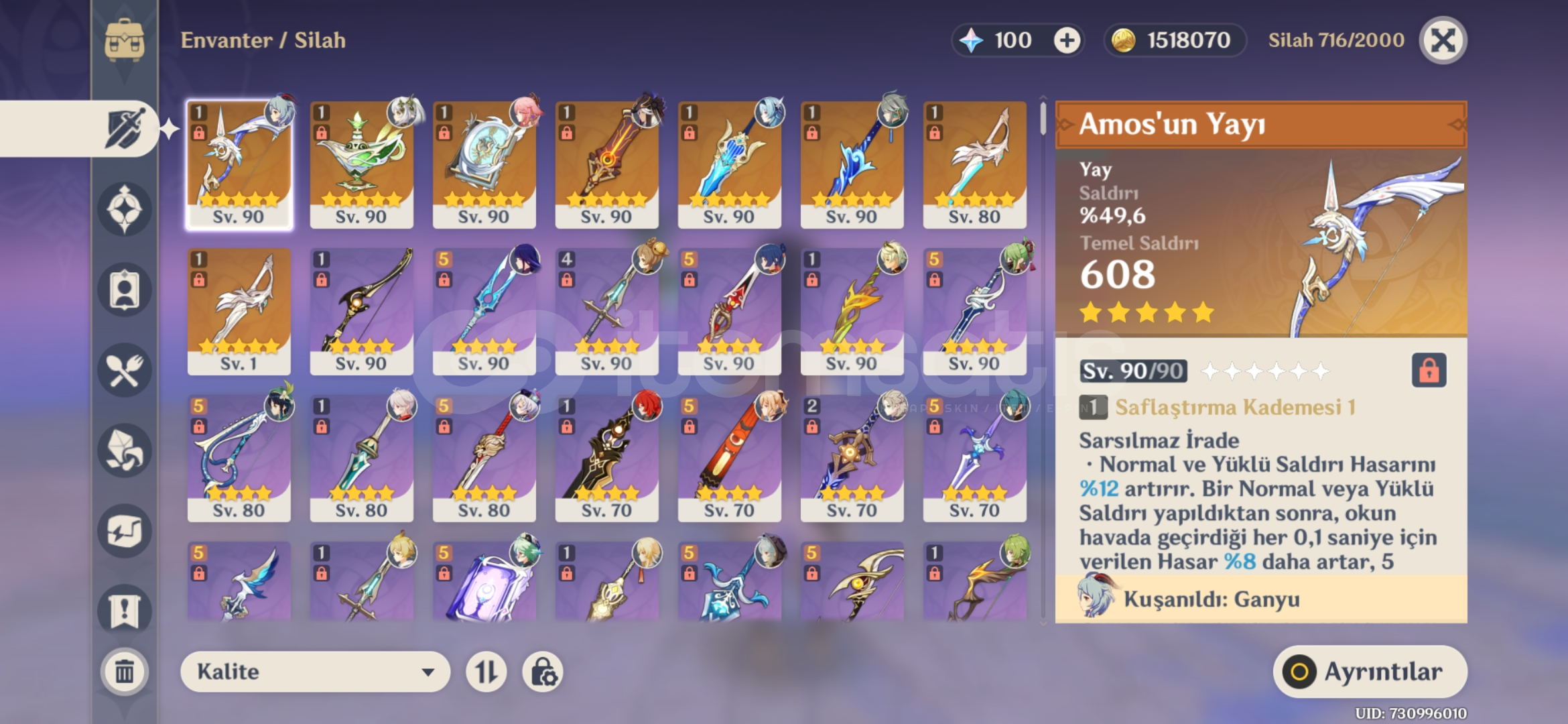Avrupa hesapidir içindeki banner karakterleri cyno nahida eula kazuha flins albedo yae miko raiden venti nilou zhongli alhaitham ganyu vardir silahlarin isimleri ezberimde yok ama gorsellerde var 23 gun welkini vardir pity 70 civari maille verecegim arti olarak cok guzel oyun ici kanatlari isim kartlari vardir ve Wish kasilcak bol yer vardir Fontaine Natlan neredeyse hic girilmemis
