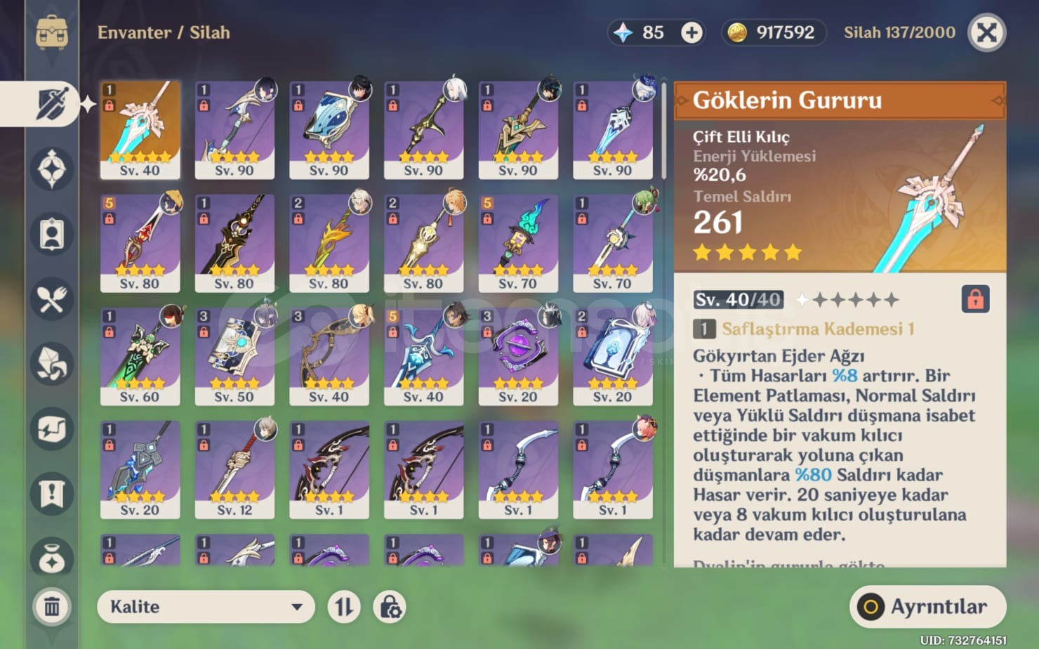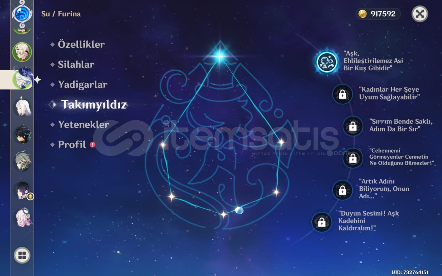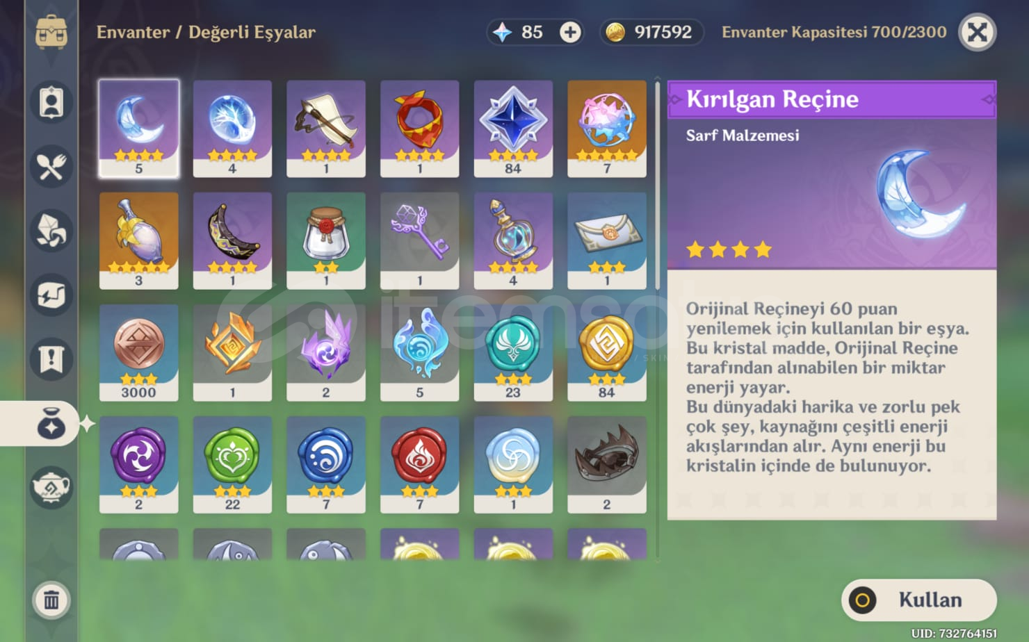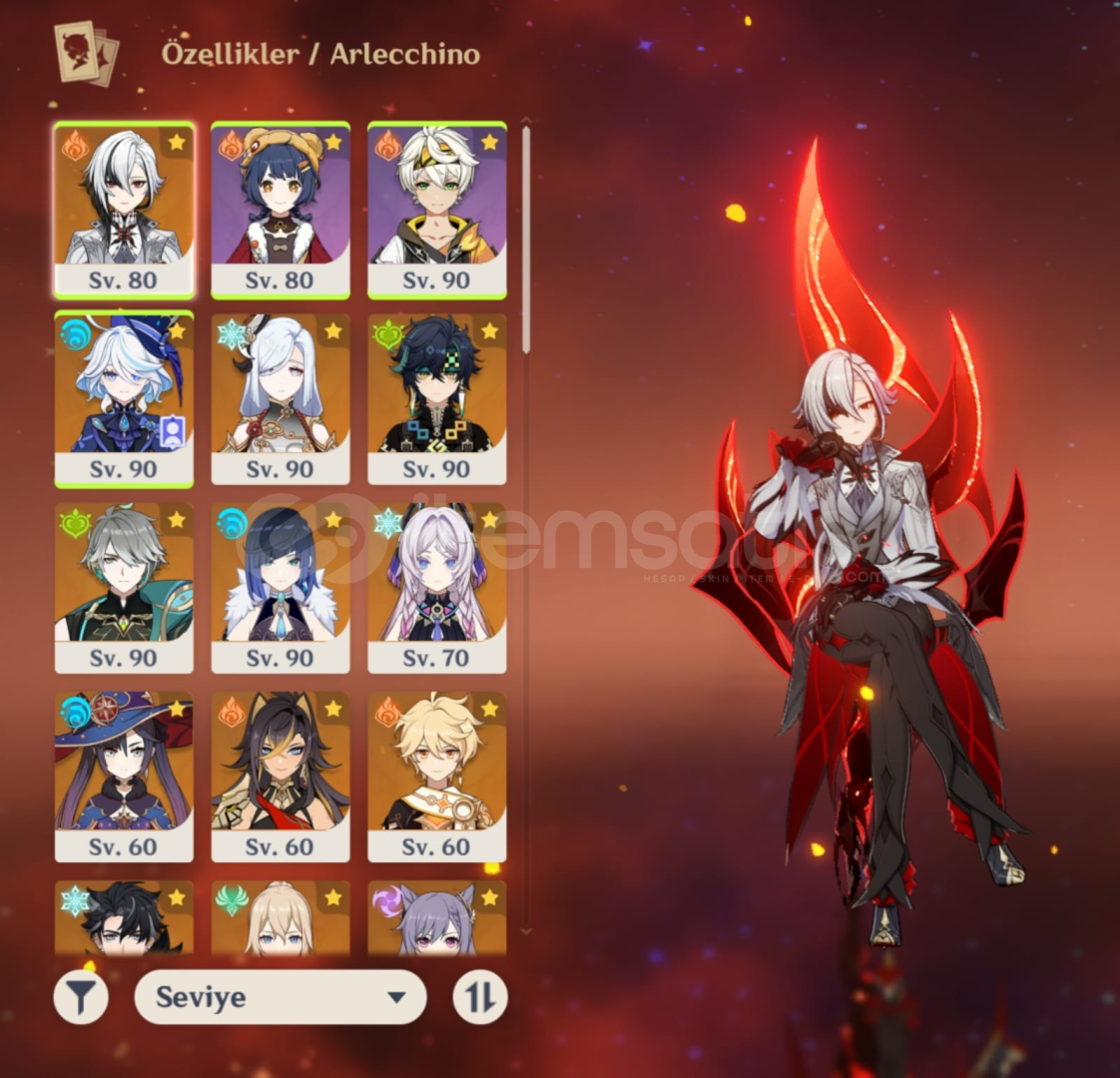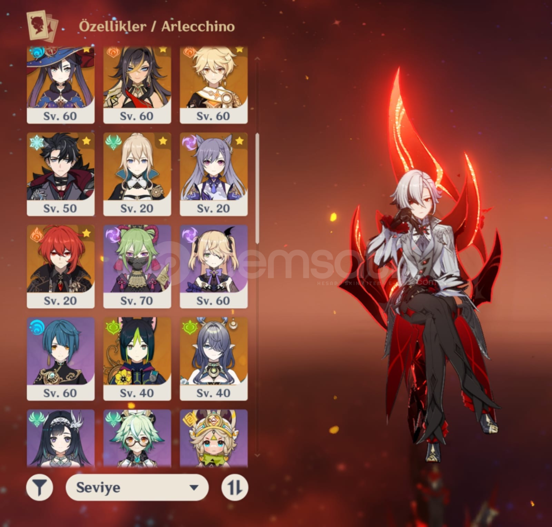 Hesapta C1 Furina vardır , ayrıca diğer meta karakterler de bulunuyor.Hesap Geri Dönüş Hesabı olduğu için bir sürü ödül veriyor.Haritaların hepsi %30 civarlarında , primo kasmak çok basittir