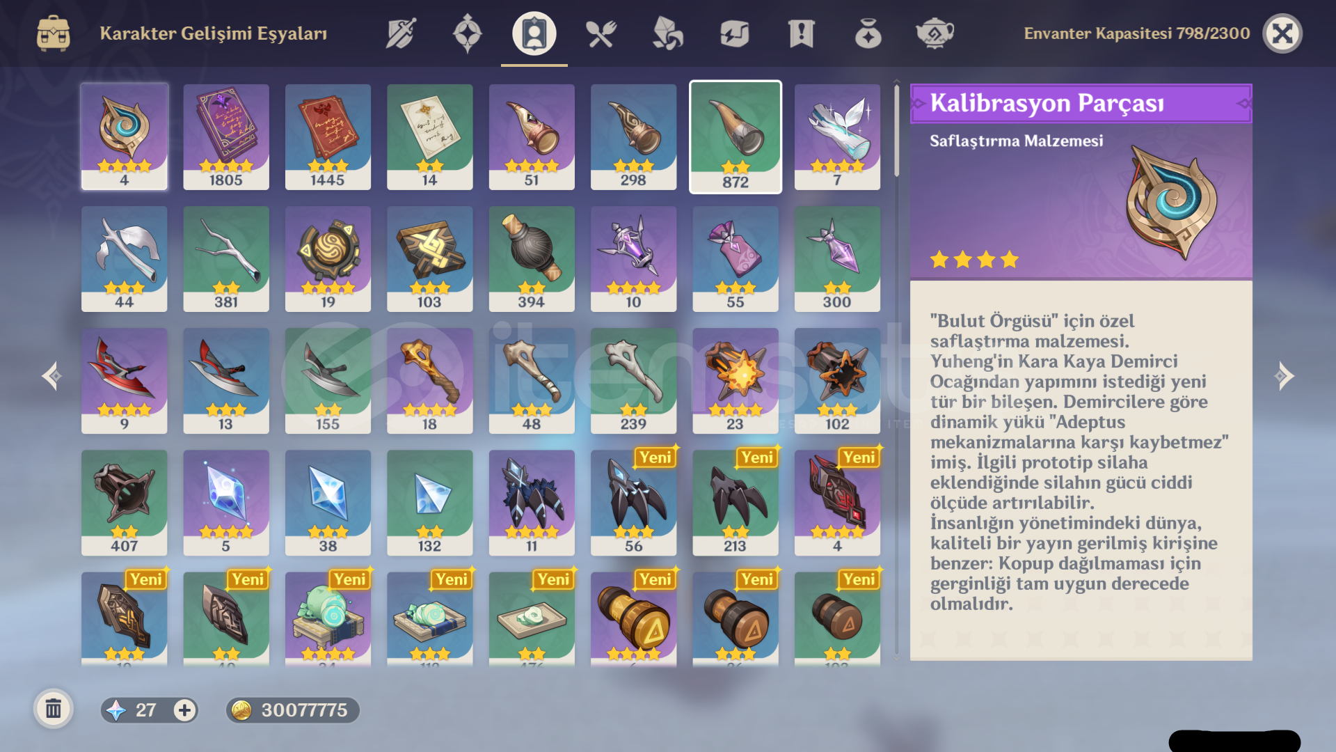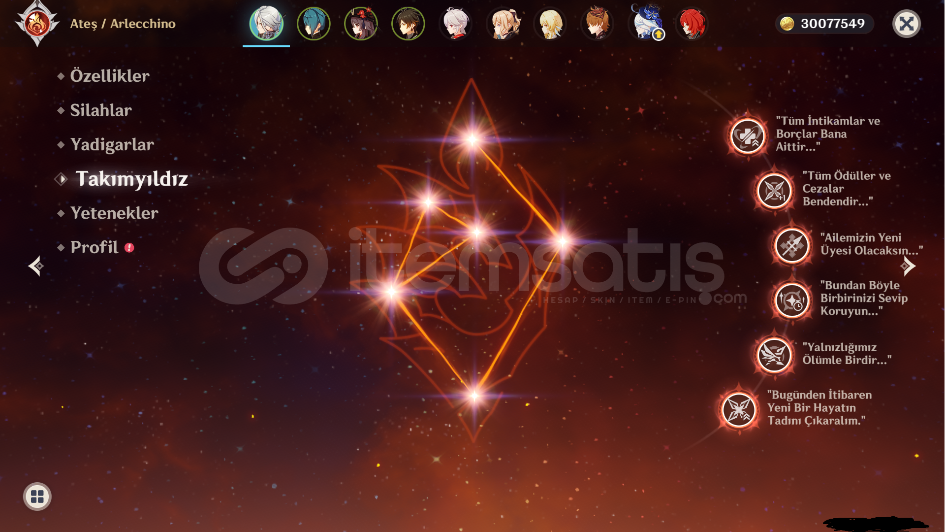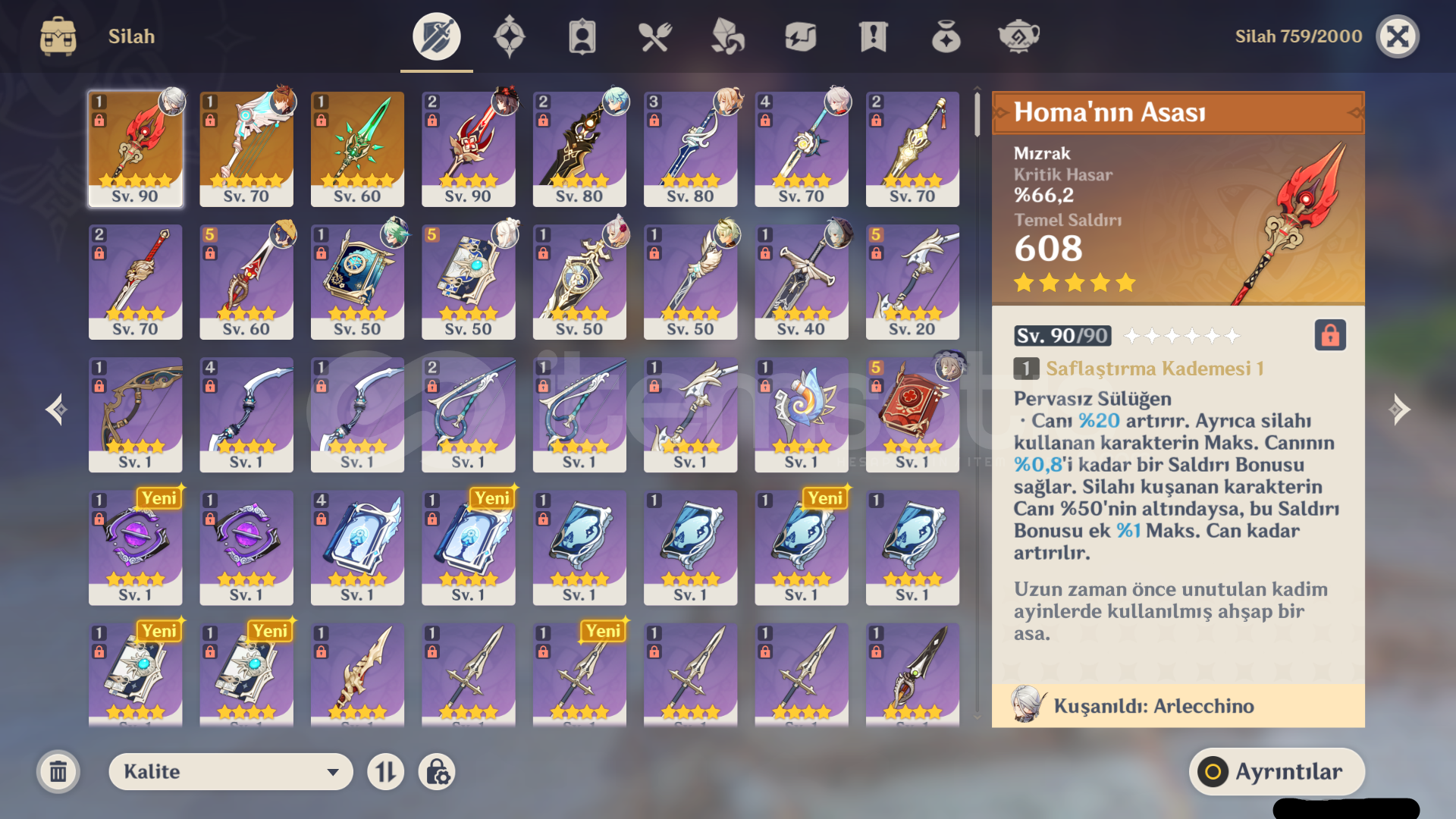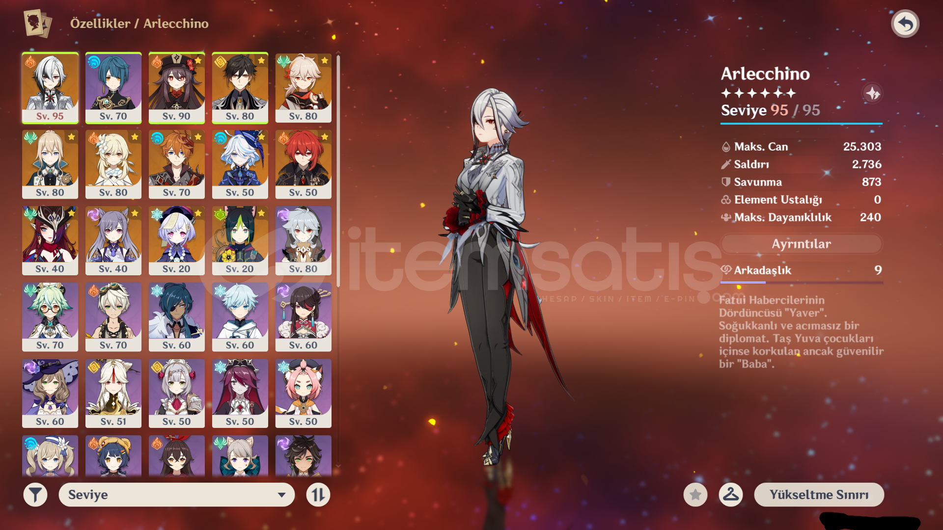 28 tane 5 yıldız var / AR 56 Arlec düz vuruşları buff olmadan 80k vuruyorSilahlar:R0 HOMAR0 JADE SPEARR0 Skyward yayKarakterler:C6 ARLECCHİNOC0 HU TAOC0 ZHONG LİC0 KAZUHAC4 JEANC0 TARTAGLİAC0 FURİNAC1 DilucC0 ChascaC0 KeqingC0 QiqiC0 Tighnari4 yıldızlı karakterler çok fazla ve consları çok yüksek detaylı bilgi almak isterseniz iletişime geçin