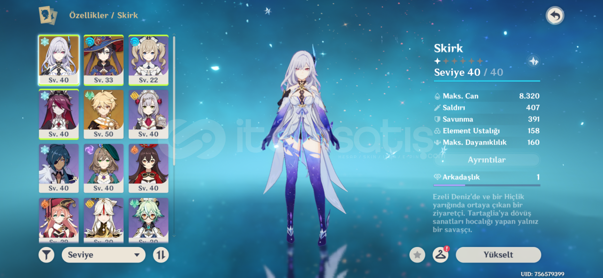 Hesap başlangıç hesabıdır. Hükümdar gorevleri duruyorMap kasılı değilEtkinlikler yapılı değil5 yıldızlılar Skirk ve MonaSkirk takımı: Skirk, Mona, Barbara, RosariaGayet güzel başlangıç hesabıdır detaylı bilgi için yazınız.