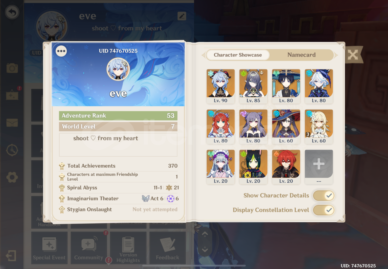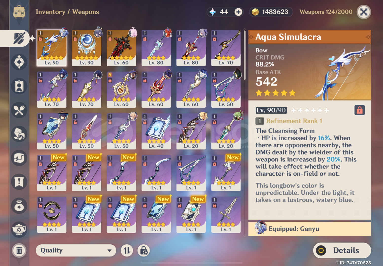 Hesap AR 53'tür, Nod Krai hariç hiçbir bölge tam tamamlanmamış ve bol bol primo kasılabilecek seviyededir.30 gün welkin ve aktif battle pass vardır.Ganyu, Nilou, Keqing ve Jean skinleri vardır.Karakterler: Lauma + bis, Ganyu, Furina, Wanderer, Nilou, Keqing, Diluc, Tighnari, Mona ve Mizuki vardır.Yeni gelen miliastra modunda karakterde ödenmiş kıyafetler vardır.Silah olarak Lauma'nınkine dahil olarak Aqua Similac...