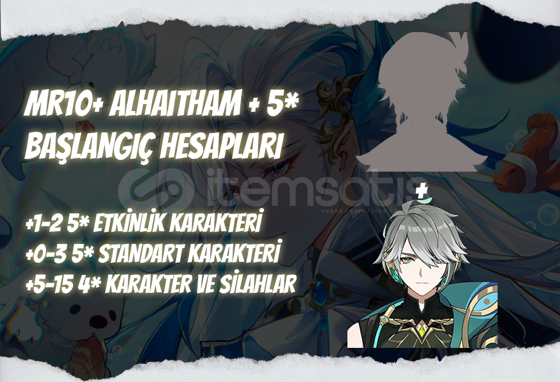 Bu ilanı satın aldığınızda MR10+ seviyesinde içerişinde Alhaitham + 1-2 adet rastgele 5* etkinlik karakteri bulunan bir hesap tarafınıza iletilecektir.Hesapların içerişinde 0-3 adet 5* standart karakter içerebilir.Hesapların içerişinde bir miktar köken taşı bulunabilir.Tüm hesaplarımız garantilidir ve alım sonrası&n...