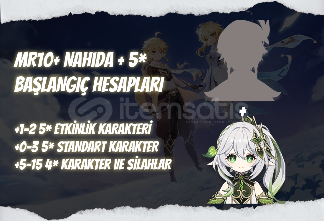Bu ilanı satın aldığınızda MR10+ seviyesinde içerişinde Nahida + 1-2 adet rastgele 5* etkinlik karakteri bulunan bir hesap tarafınıza iletilecektir.
