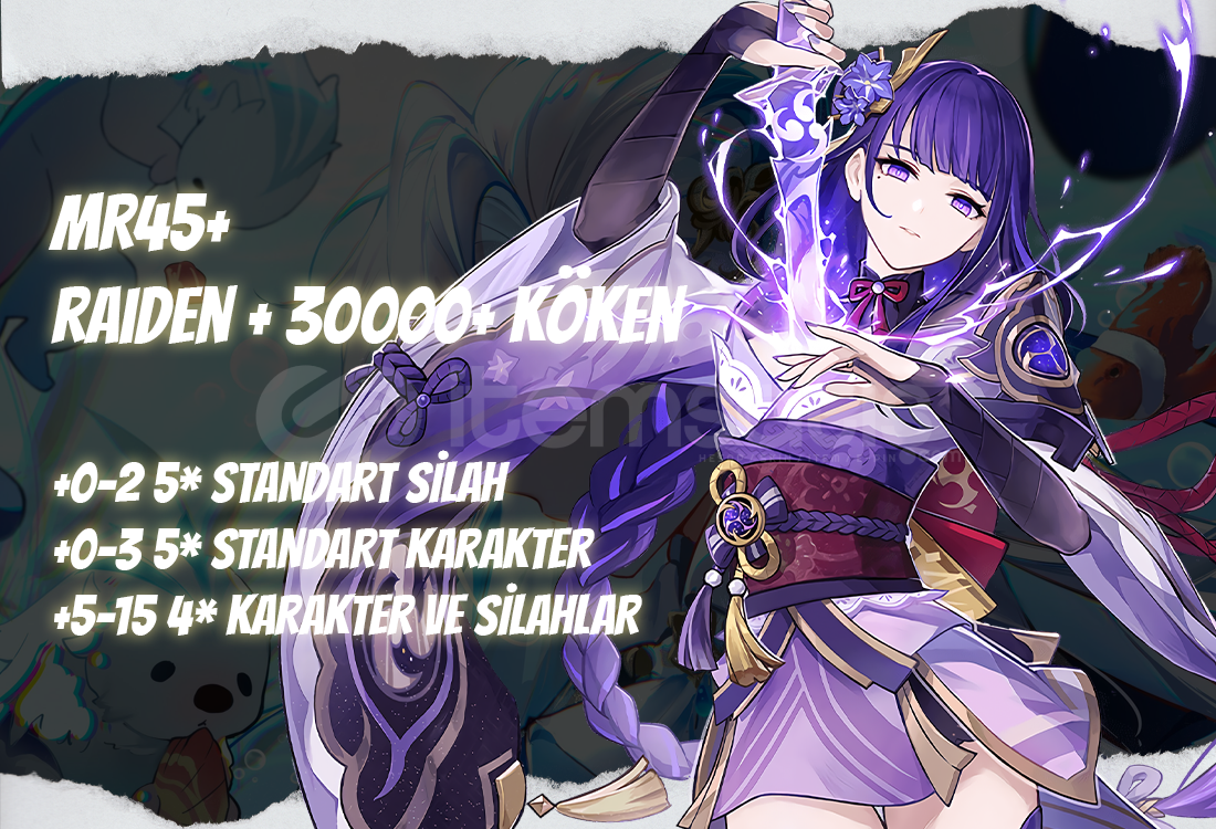Bu ilanı satın aldığınızda MR50+ seviyesinde içerişinde Raiden Shogun ve ilanda belirtildiği kadar Köken taşı bulunan bir hesap tarafınıza iletilecektir.