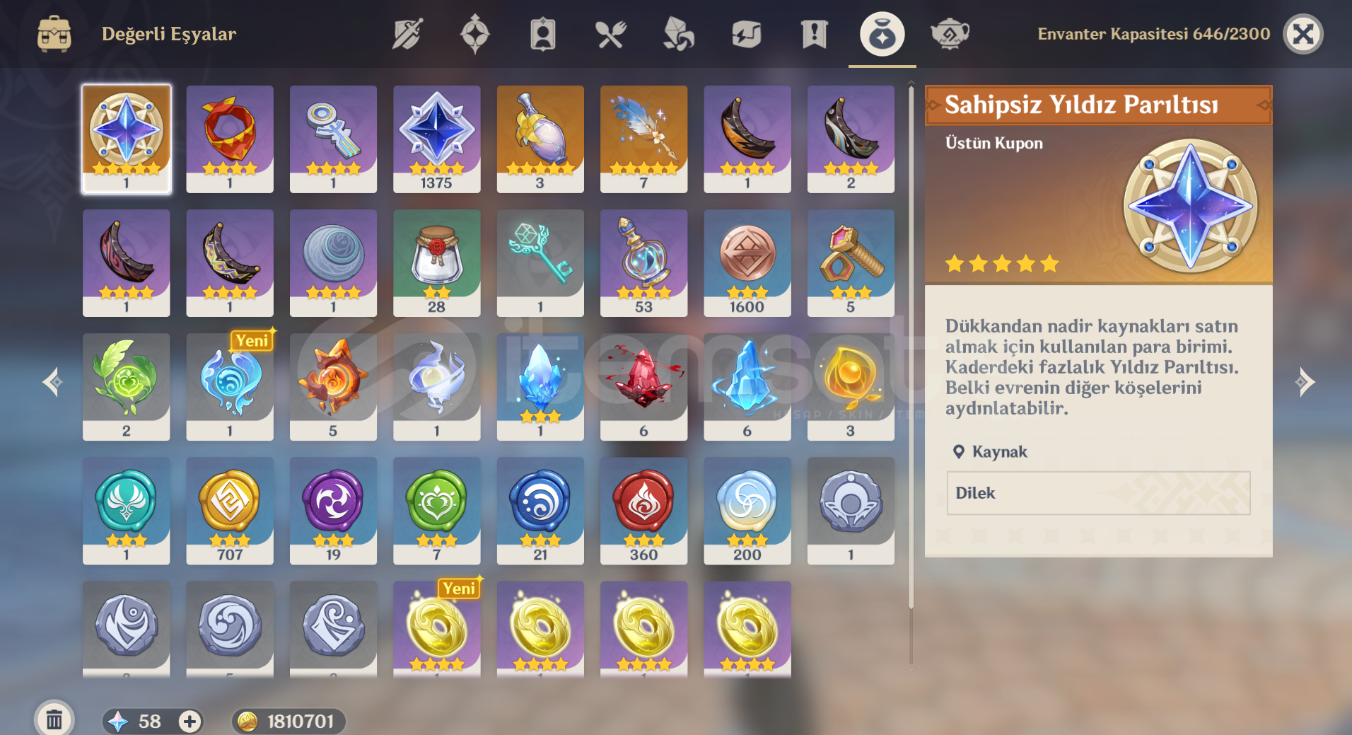 Ayaka • Ayato • Yelan • Arlecchino • Yae Miko • Furina • Diluc • Keqing • yumemizuki (C0) Yae Miko silahı vardır.teapot 10 lvl. doğum gğnü girili.4x5 yıldız silahSucrose – C3 CONS OLMAYAN 4 YILDIZ KARAKTERLERİ YAZMADIM. BİLGİ İÇİN DM.Xingqiu – C3Xiangling – C2Collei – C4Rosaria – C3Yun Jin – C3Kuki Shinobu – C3Kirara – C2Aino – C3Lanyan ...