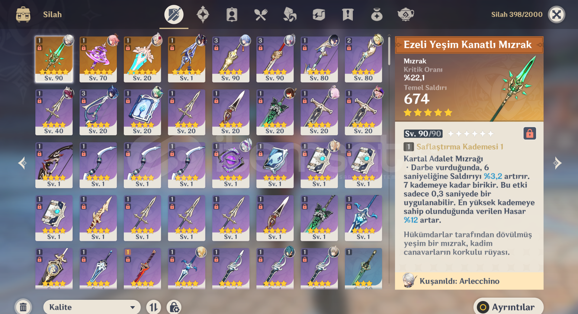 Ayaka • Ayato • Yelan • Arlecchino • Yae Miko • Furina • Diluc • Keqing • yumemizuki (C0) Yae Miko silahı vardır.