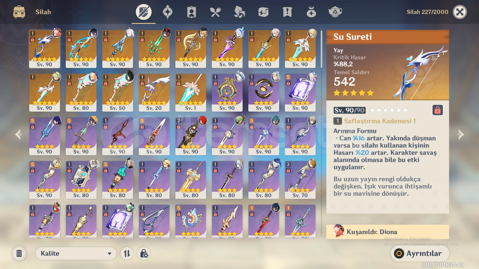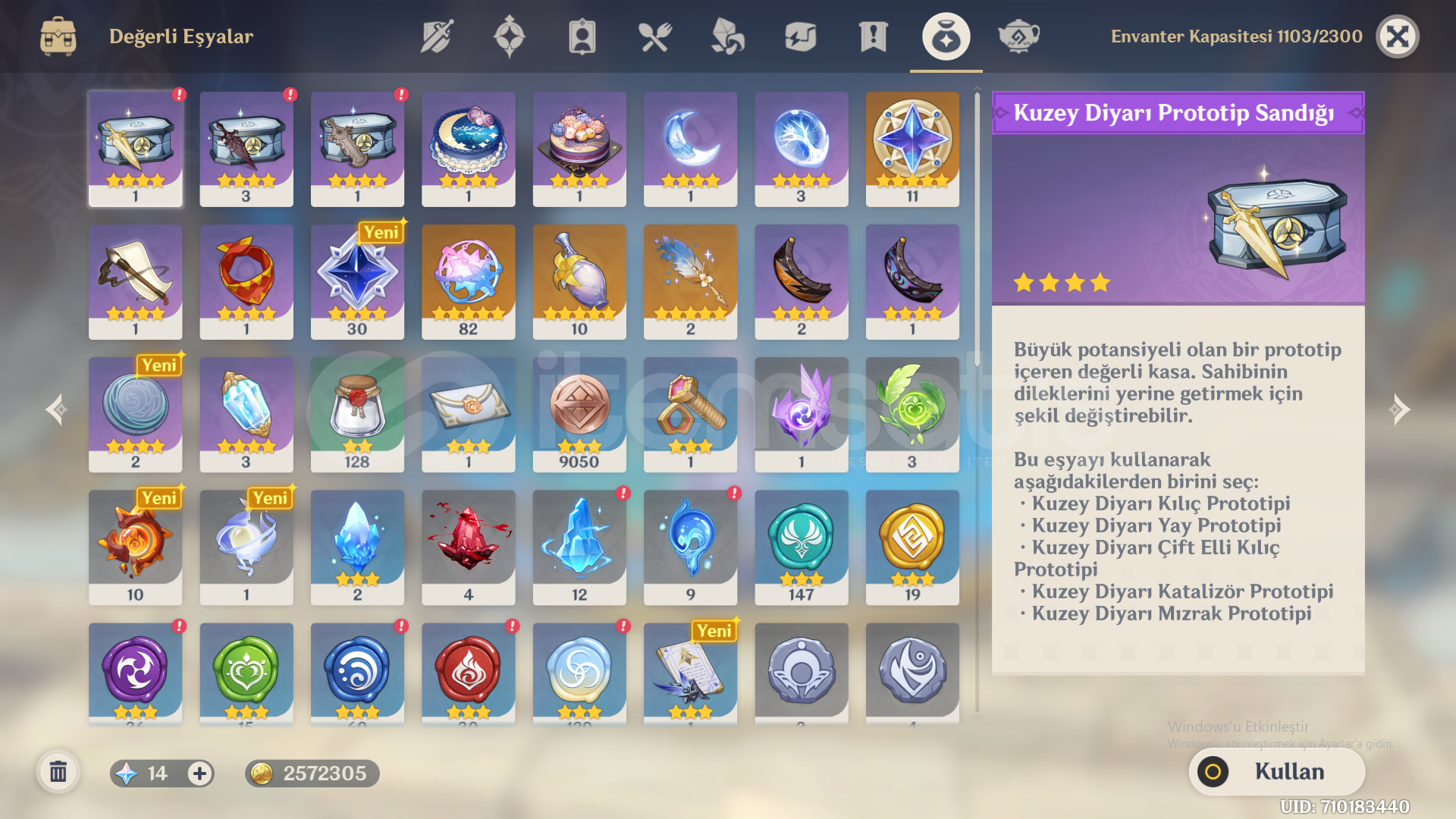 Hesapta bulunanlar:Endgame EU Hesap, fiyatta pazarlık yapılır.82 Wish ve 64 Pity.Ayaka, Xiangling, Fischl, Barbara, Ningguang, Kirara, Kaeya, Lisa Skinleri mevcut.Etkinlikten alınabilen Cons 5. haftada.Özel 5*lar; Furina!, Shenhe!, Citlali!, Skirk!, Zhongli!, C1 Kazuha!, Ayaka!, Raiden!, Mualani!, Neuvillette!, Yelan!, Kokomi!, C1 Hu Tao!, Xilonen!, Navia!, Nahida!, Nilou!, Emilie, Ayato. Kasılı olanların yanına Ünlem ! koydumStandart 5*lar; C2 T...