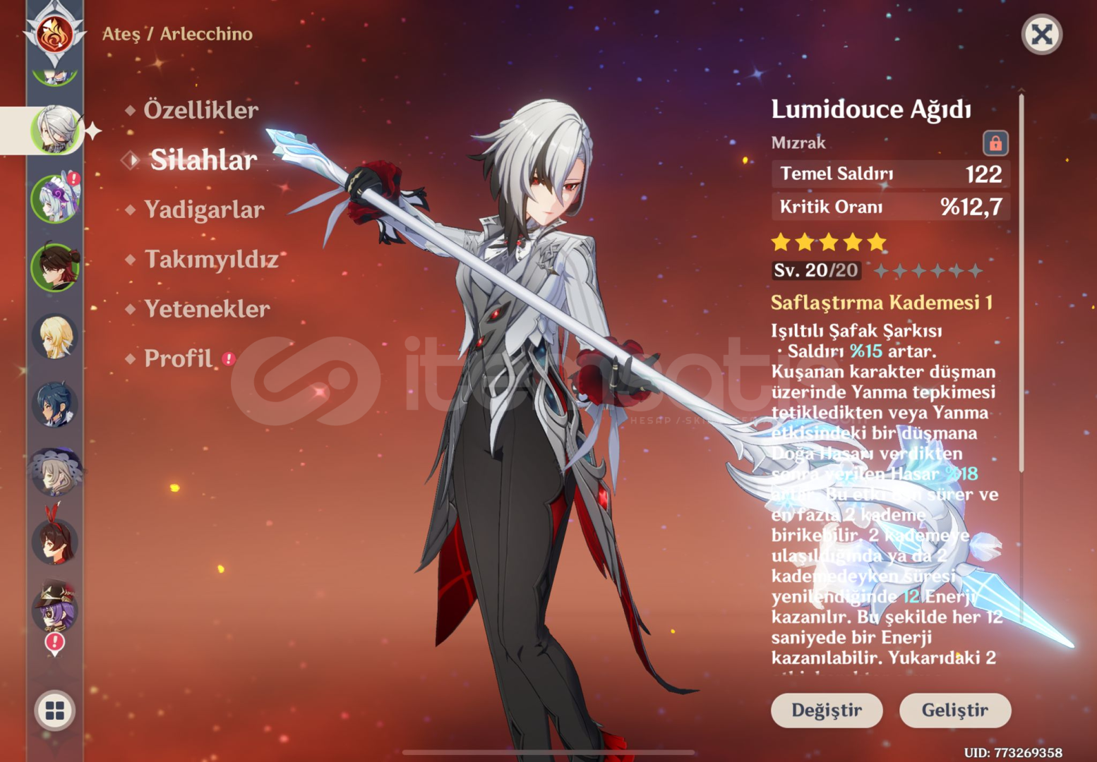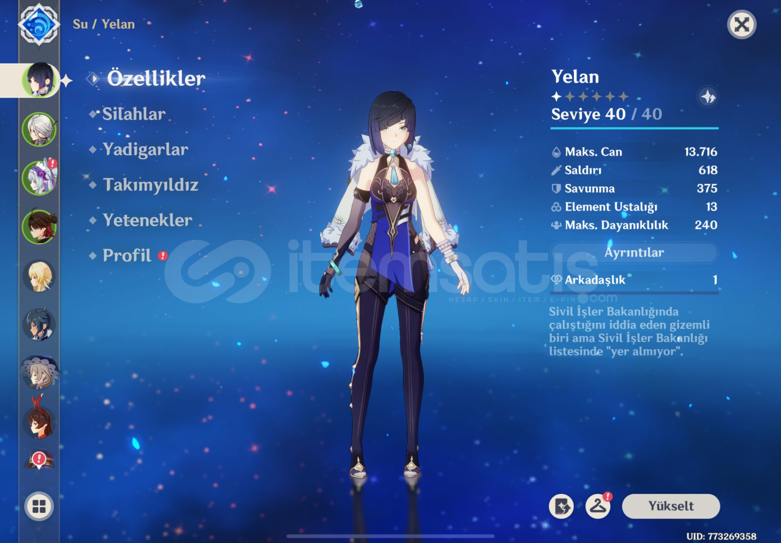 Genshin Impact AR 46 orta hesap EUArlecchino Emilie signature weapon (lumidouce ağıdı)Yelan + Yelan’ın signature weapon’u (Su sureti)hesapta kendi e postam bulunur satin alindiktan sonra her bilgiyi degisebilirsiniz