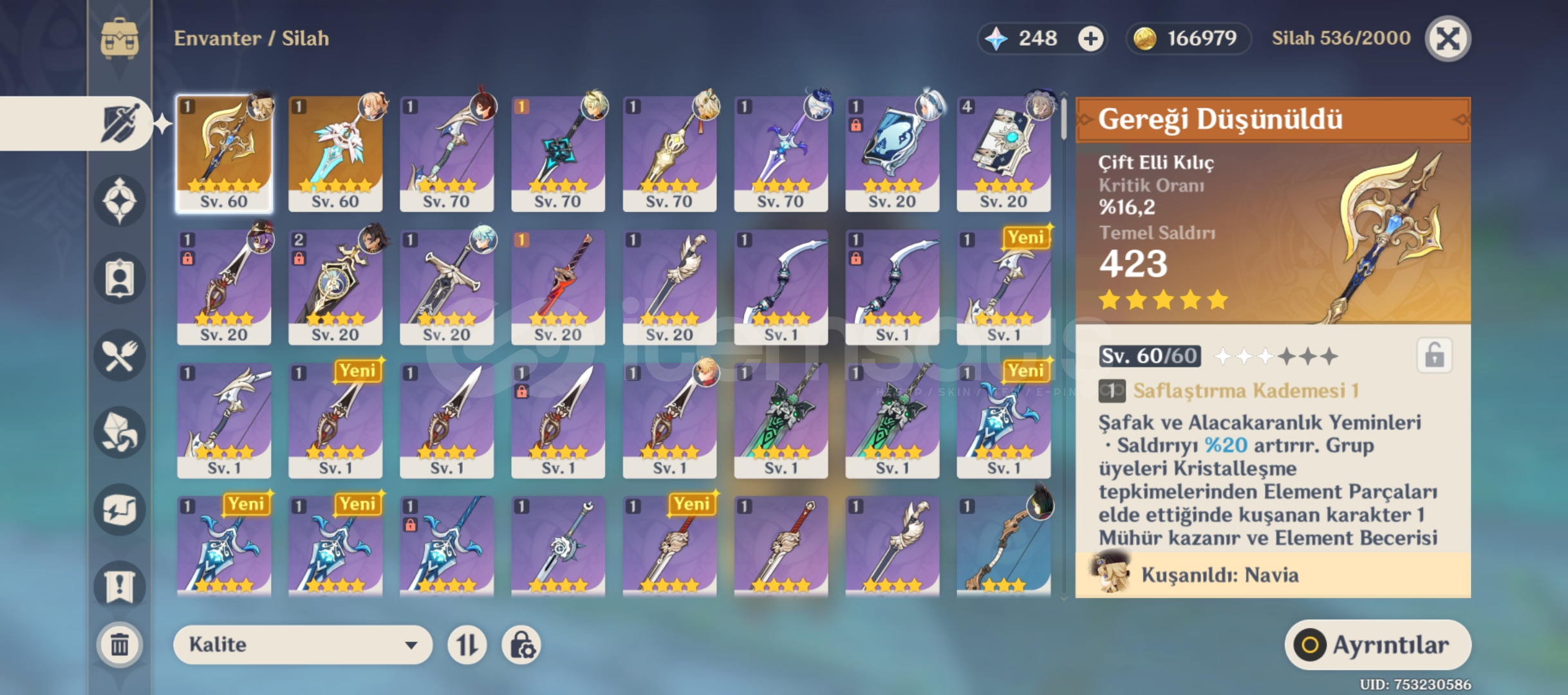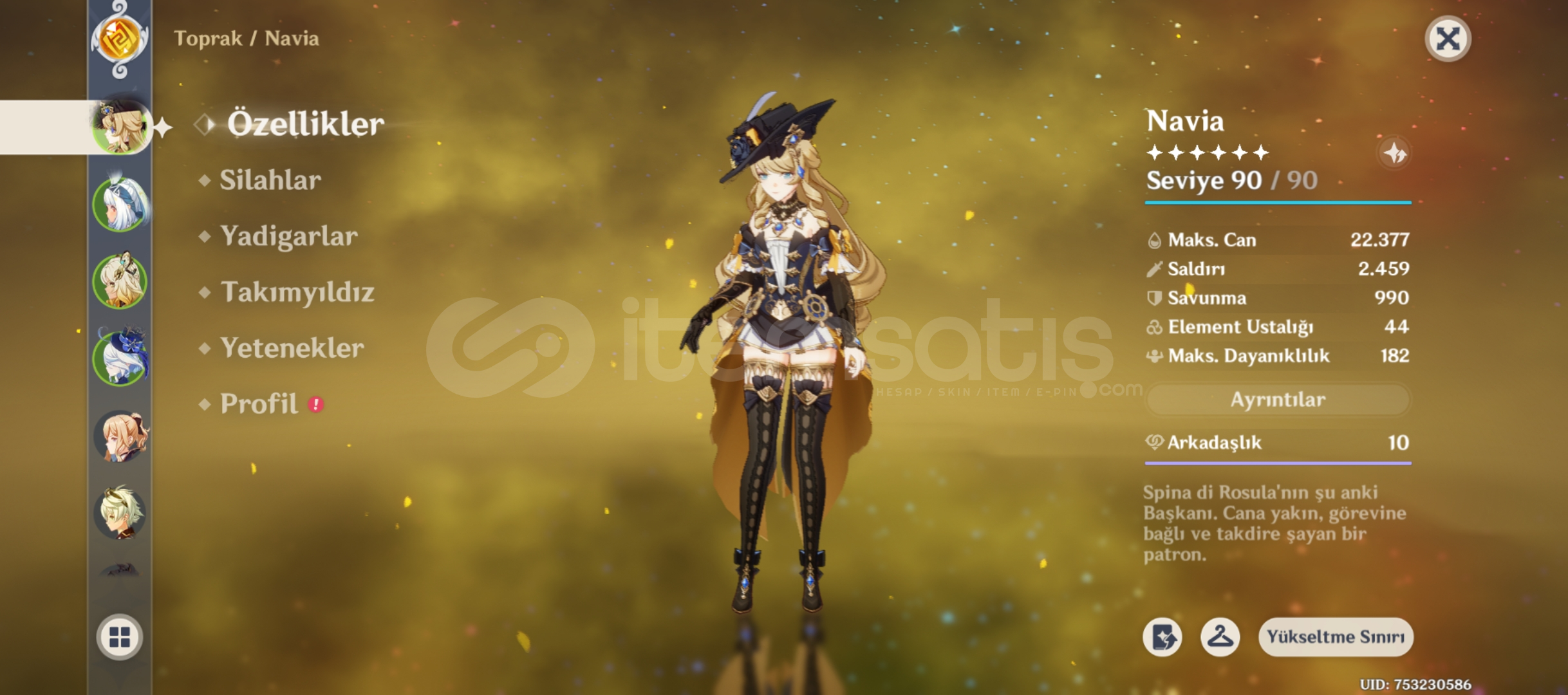 Hesap 3-4 senelik hesabı alıcak kişi istediği karakteride çıkarsın diye 73 pityde bıraktım haritada hiçbir yer 100 keşfedilmedi hesap Ar54 Tür Bitek navia 90 seviye ve imza silahi var. Hesapta gezginle beraber 10 tane 5 yıldızlı karakter vardır 2 tanede 5 yıldızlı silah vardır hesap satın alan kişinin e postasına aktarilacaktır acil para ihtiyacım olduğu iç...