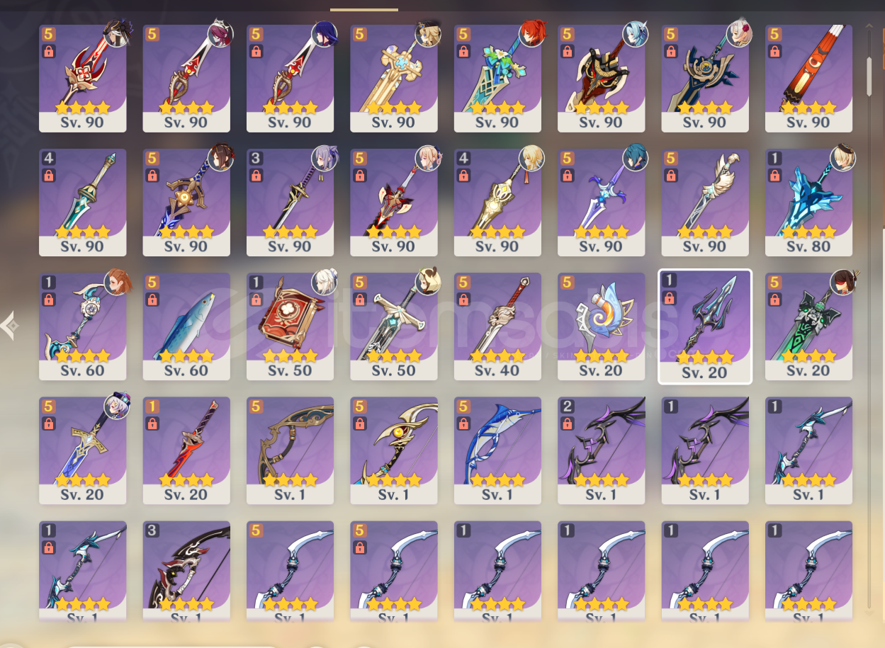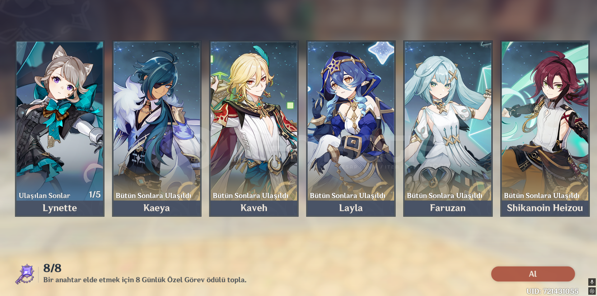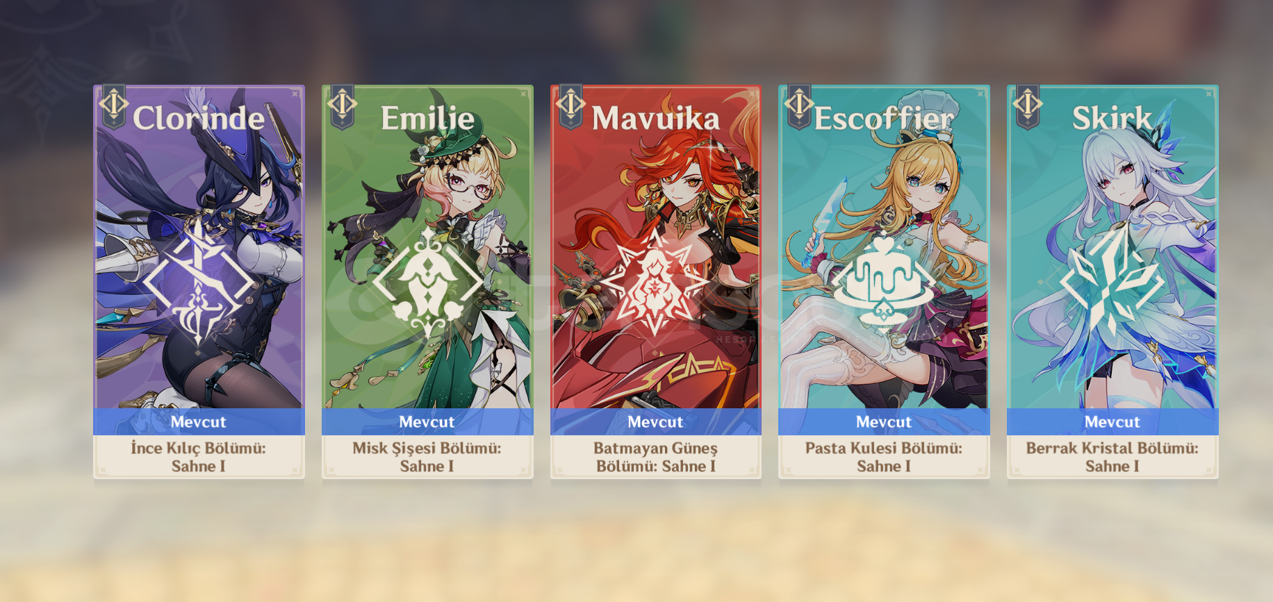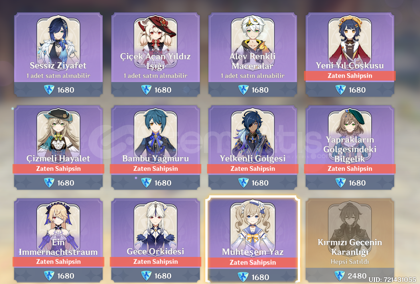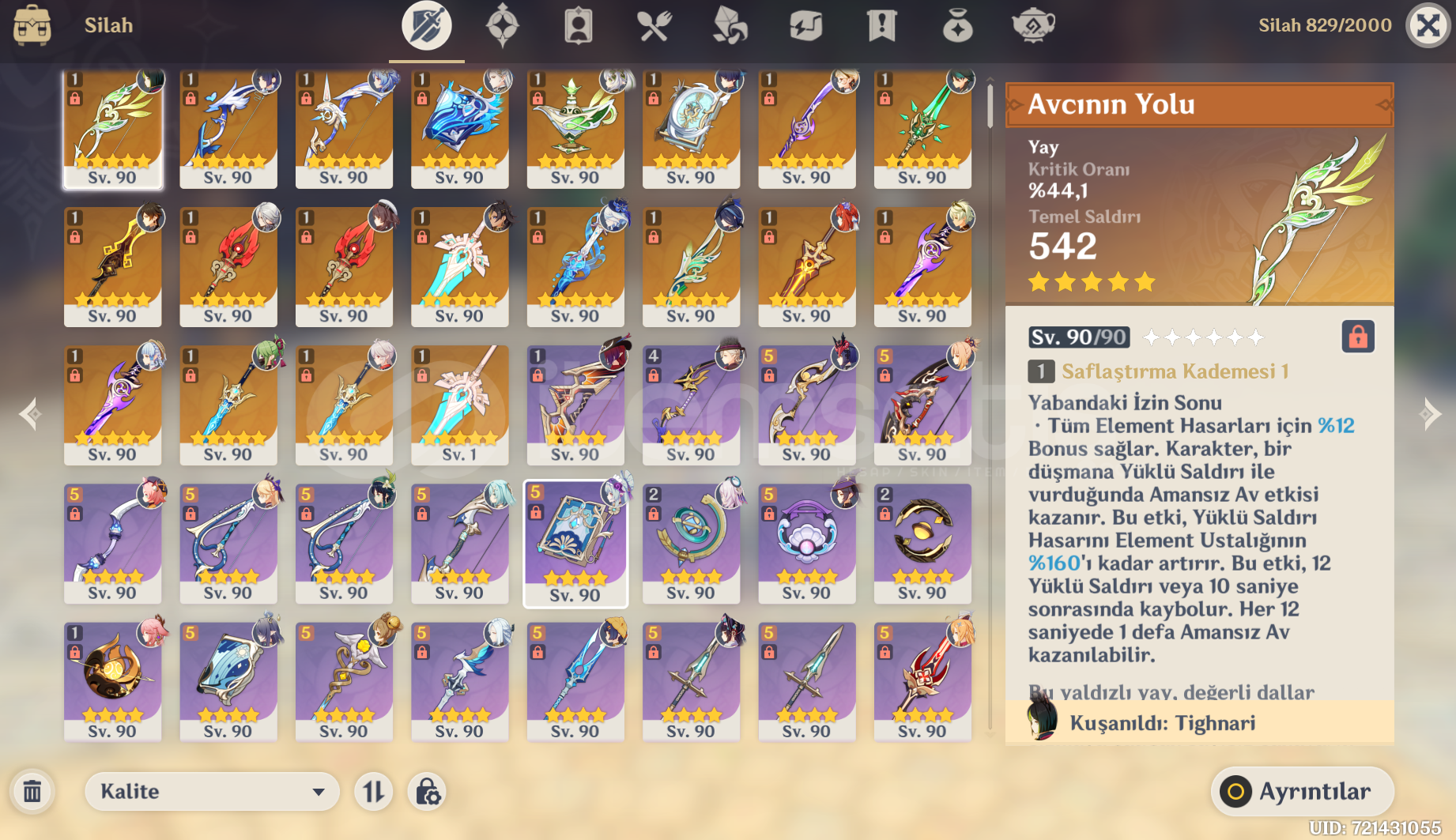 5* Karakterler ;Aloy C0Citlali C0Furina C0 R1Lauma C1Neuvillette C0 R1Raiden Shogun C0 R1Escoffier C0Venti C0Kamisato Ayaka C0 R1Lyney C0Jean C4Chiori C0Navia C0Zhongli C0 R1Chasca C0Scara Mouche C0Kaedehara Kazuha C2 R1Xiao C0Shenhe C0Eula C0Ganyu C0Clorinde C0Cyno C0Yae Miko C0Keqing C1Emilie C0Nahida C0 R1Tighnari C2 R1Mualani C1Sigewinne C0Nilou C0 R1Yelan C0 R1Mona C2Arlecchino C0Dehya C3Yoimiya C0Hu tao C0 R1Diluc C6Yumemizuki Mizuki C0Qiqi C54* Karakterler ;Yun jin C6Noelle C6Faruzan C6Fr...