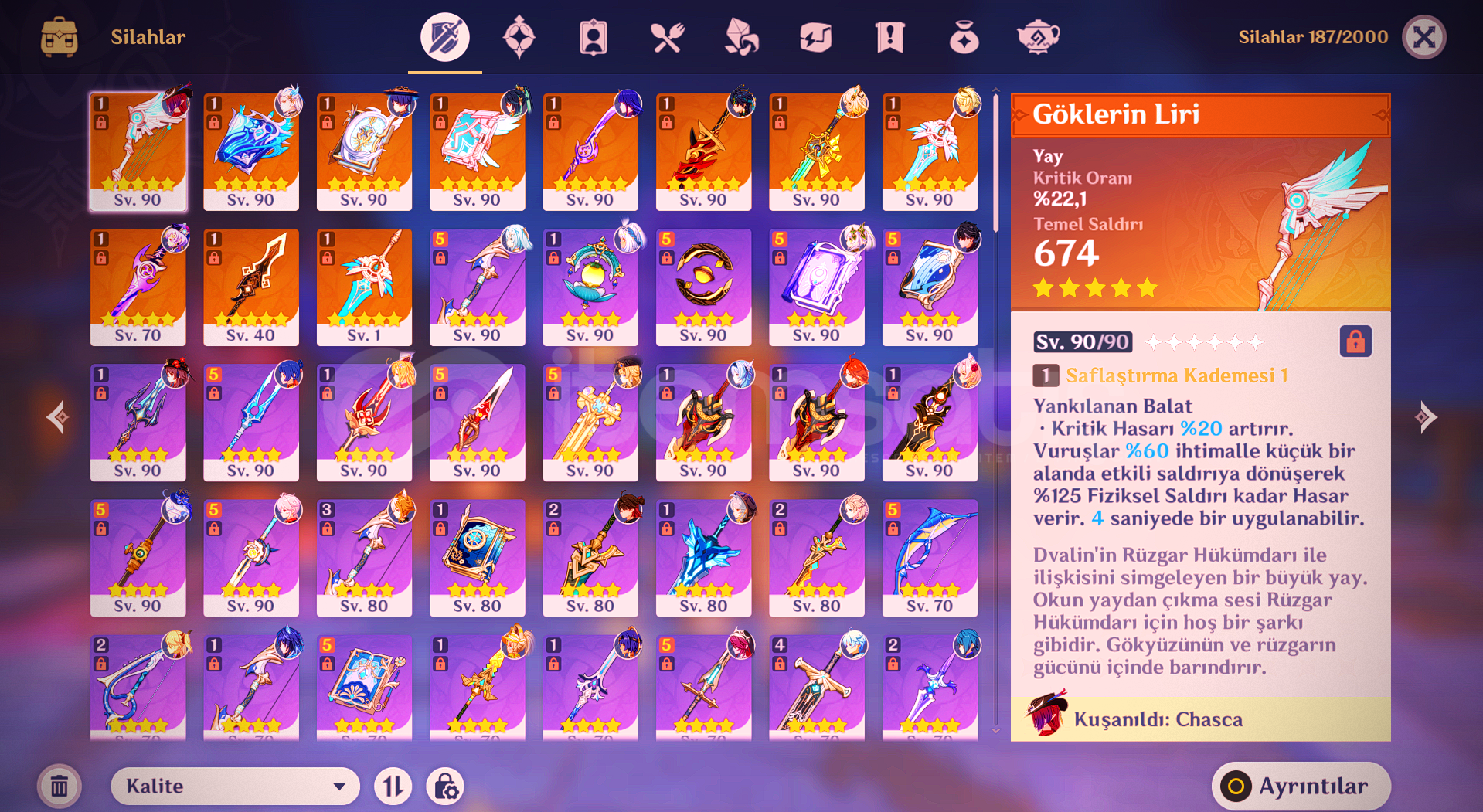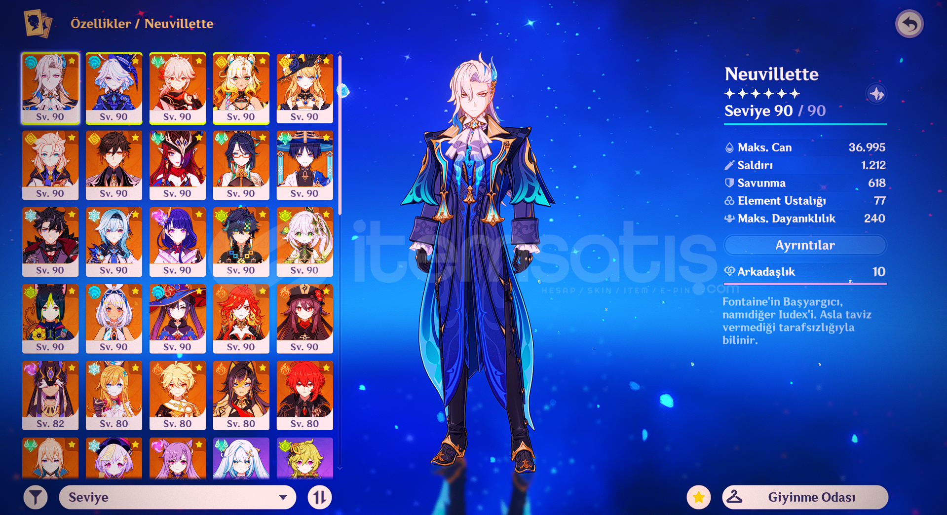 Hesap içeriğine Görsellerden Ulaşabilirsiniz.EU Sunucu - 59 AR - 170 Günlük Welkin Bulunmaktadır.Karakter Bannerında Rate Up Mevcuttur. Map Kasılıdır.Karakter Bannerı 50 Pity - Silah Bannerı 17 Pity - Nostaljik Banner 45 PitySorularınız olursa sorabilirsiniz.Çoğu 4* Karakter Cons 6 veya Cons 6 ya yakındır.Avare C1Neuvilette C1Chasca C1Wriothesley C1Mevcuttur.Lezzet Kanatları Ve Diğer Kana...