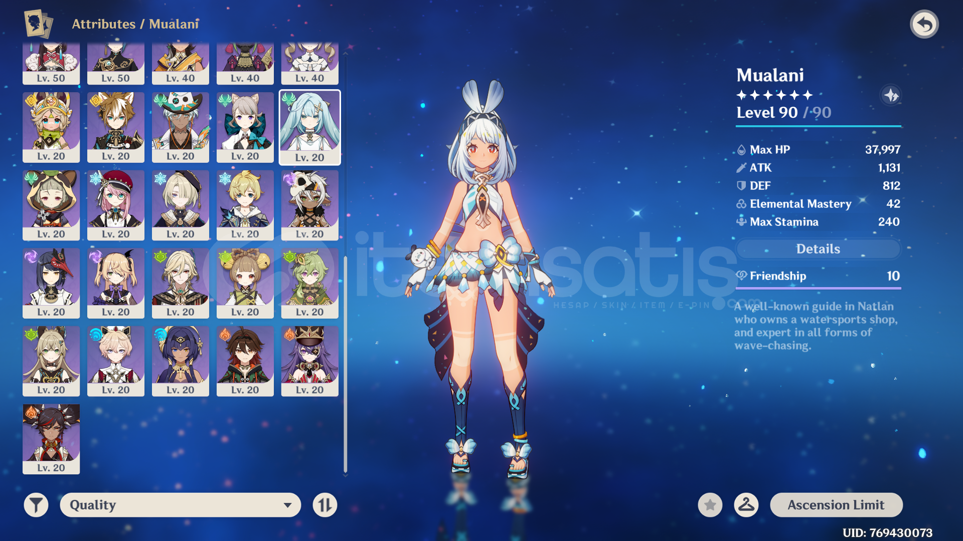 RATEUP Mevuctturkarakter pity 59mualani ve neuv buildlimualani rahat 300k yaparHaritalar :Mondstadt 100%Dragon Spine : 75%Liyue : 65%Inazuma : 60%Sumeru : 40%Fontaine : 54%Natlan : 50%Nod Krai : 0%Enkanomiya : 50%The Chasm : 65%Sea of Bygone Eras : 20%Ancient Sacred Mountain : 56%hesaba yeni lauma karakter geldiginden beri girilmemistirkasacak cook primo varhesab benim kisisel hesap oyunu biraktigim icin satiyorumherhangi bir sorunuz varsa mesaj yazabilirsiniz.