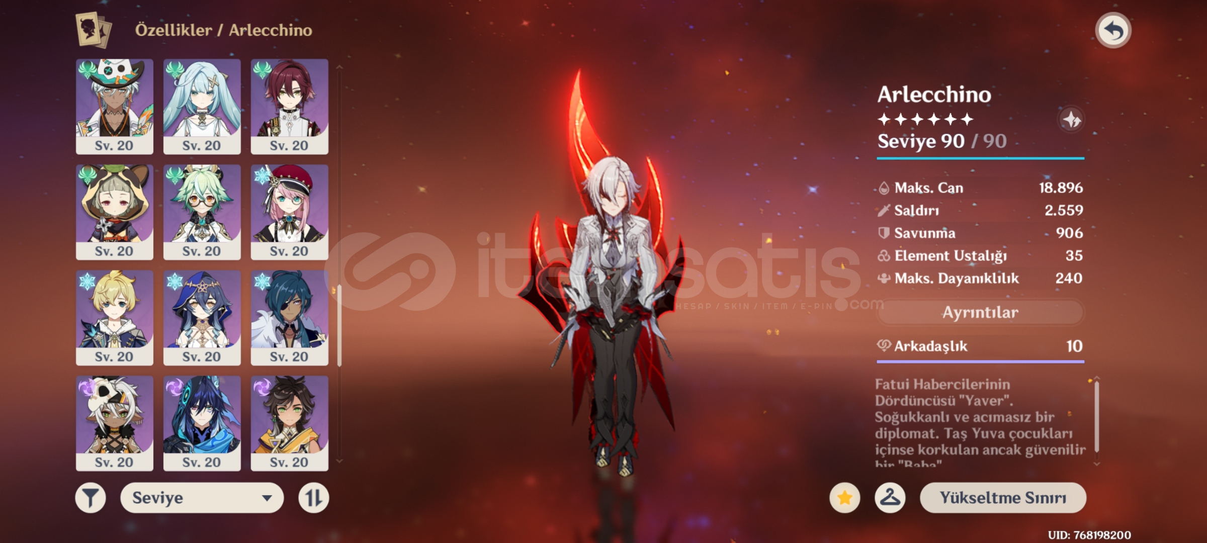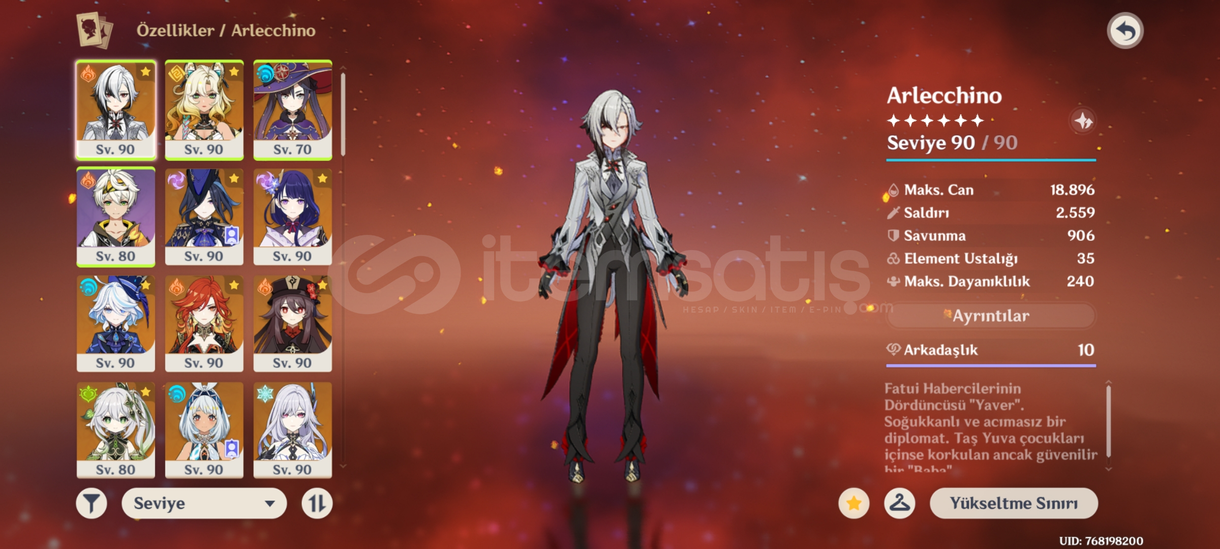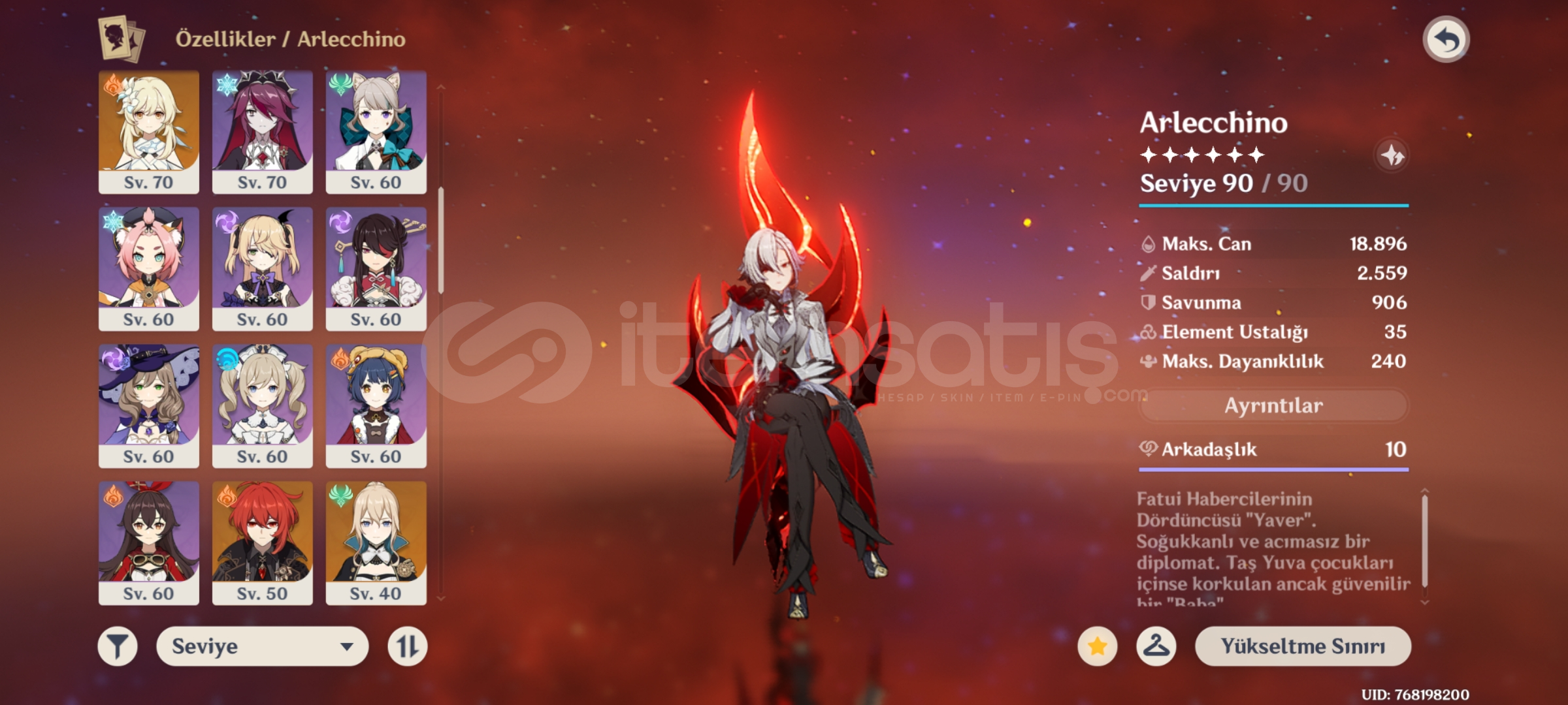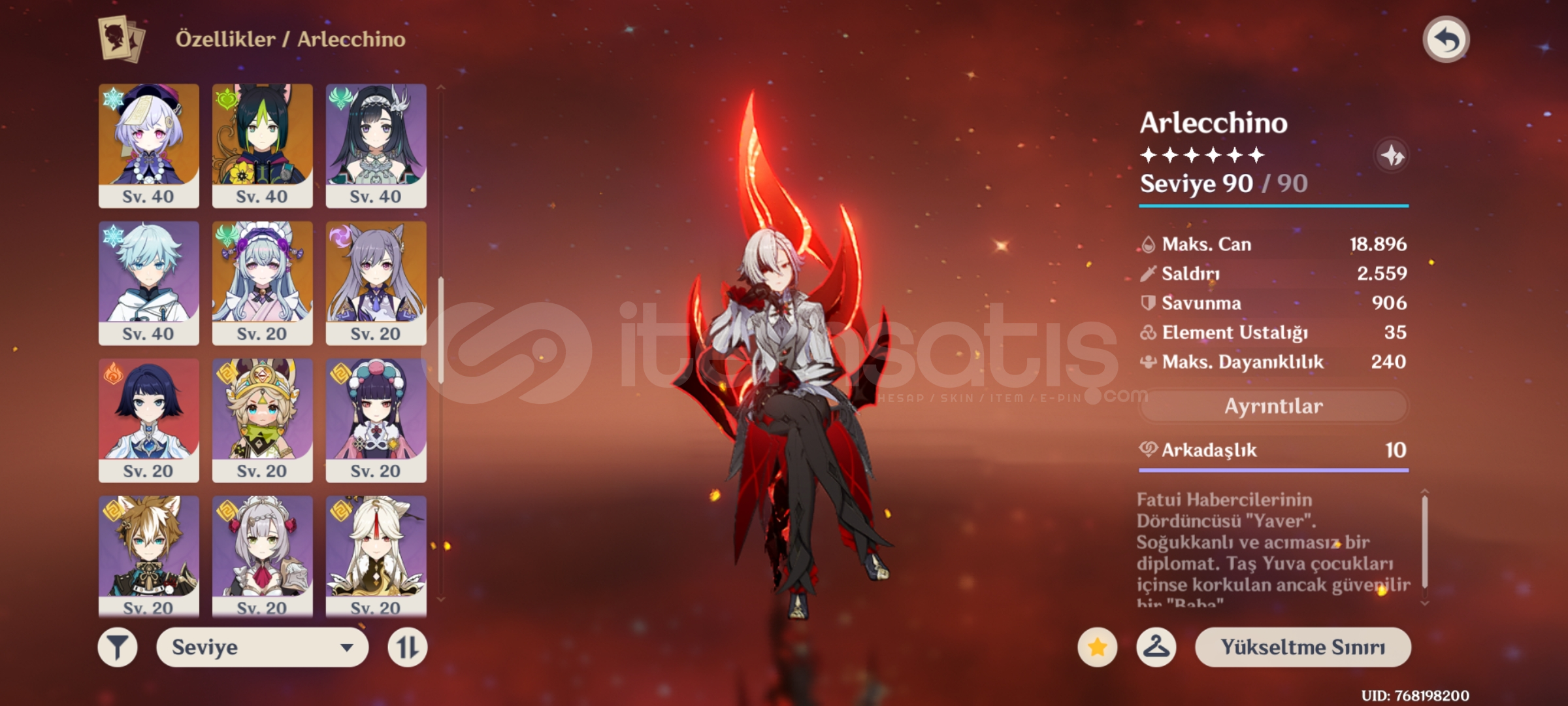 Hesabım da Arlecchino c1+kendi silahı/furina c2/skirk ve skirk in kendi silahı/hu tao c1/ mona c2/ Arlecchino mavuika ve furina gibi karakterler çok iyi kasıldı 2 yıldır her gün oynuyorum haritada daha çok köken taşı kasılacak yer var çogu yer %20ve%40 arası keşif edildi ve haritada açık olmayan yer yok çogu hükümdar görevi bitti ve çogunlugu kısa dünya görevleri kaldı emek harcan mış hesap isteyene daha fazla fotoğraf ekleye bilirim çok fazla koymadığım şeyler var indirim vardır ama fazla yapamam acil lazım