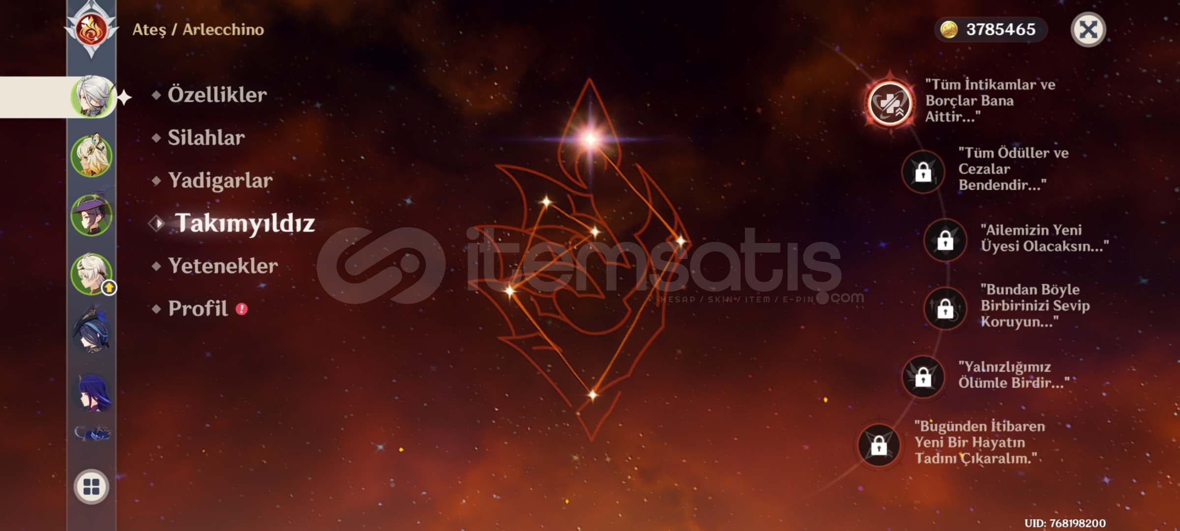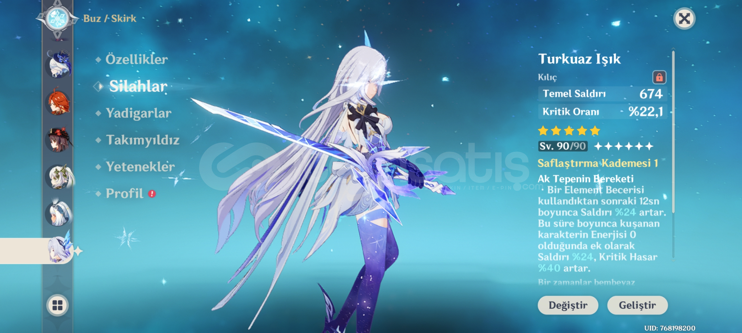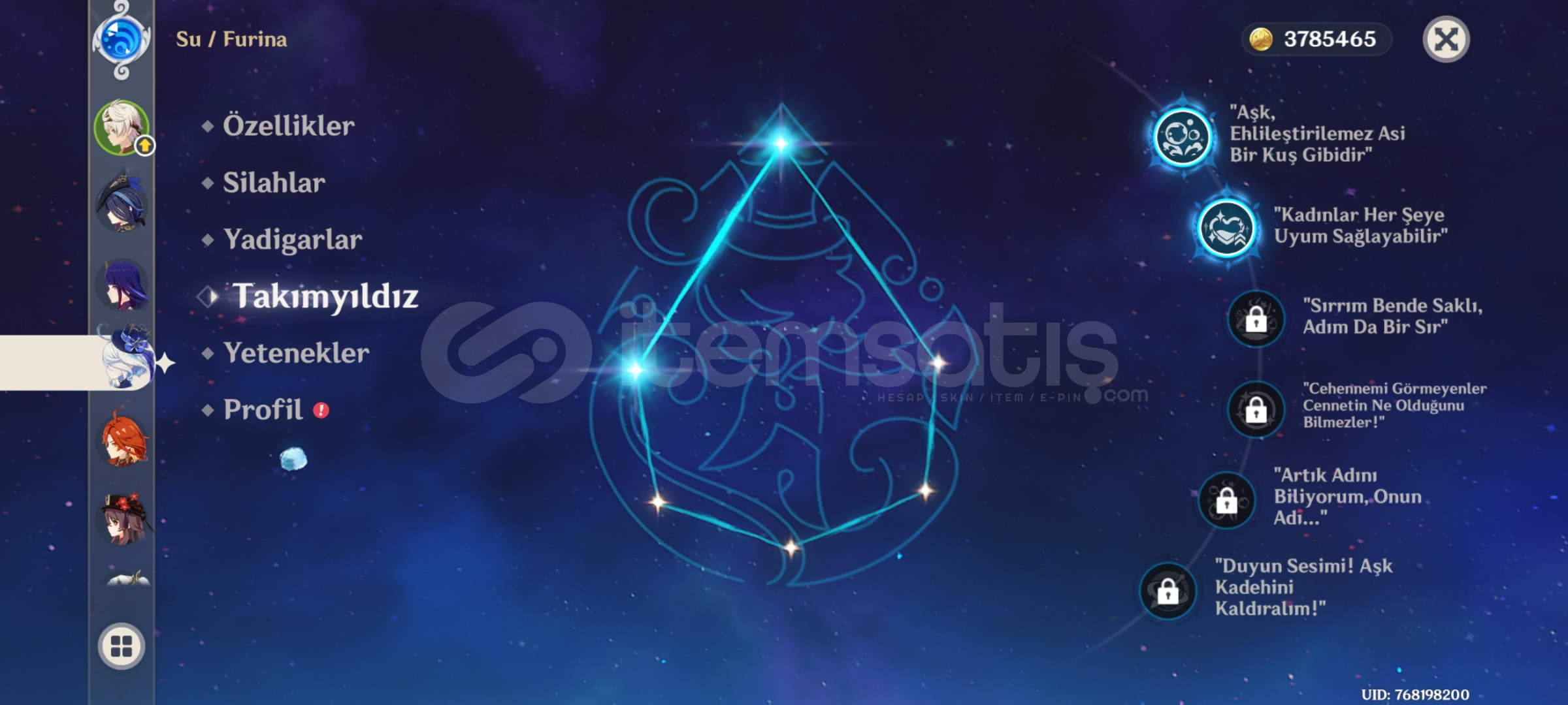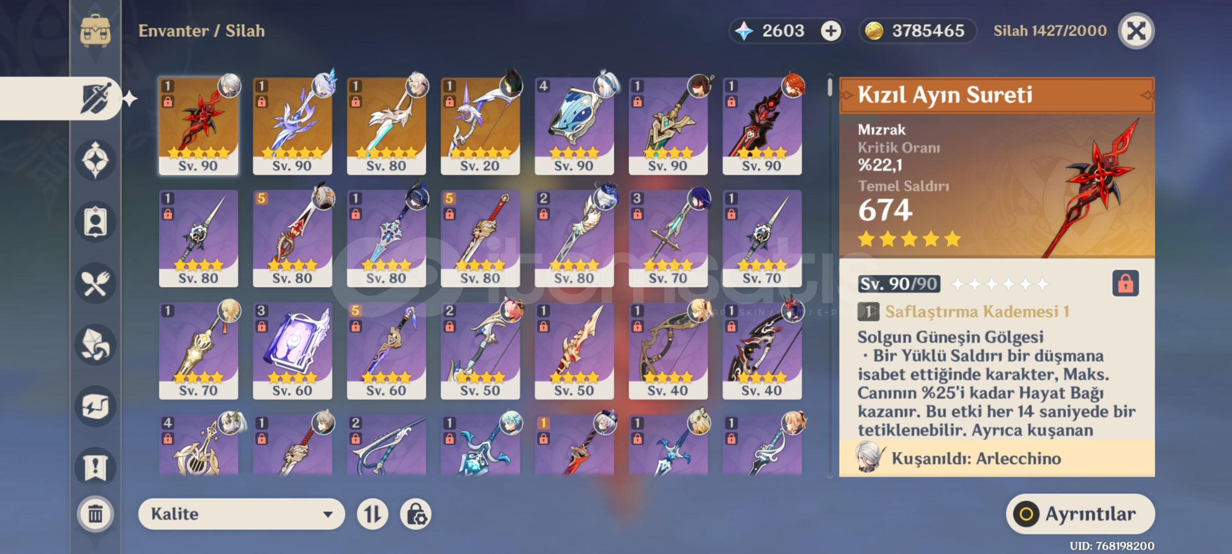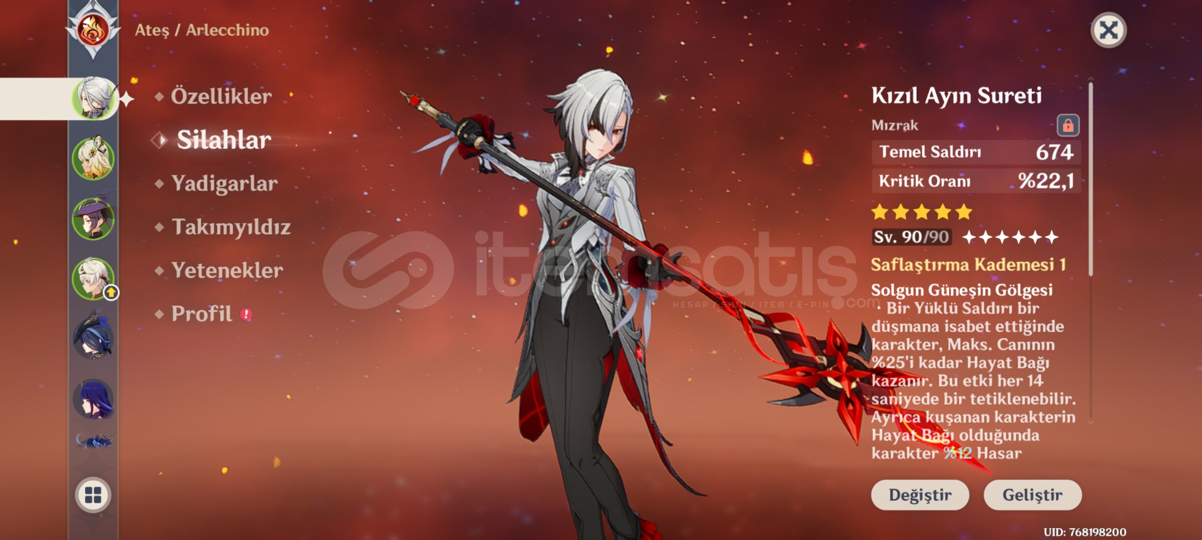 Hesabım da Arlecchino c1+kendi silahı/furina c2/skirk ve skirk in kendi silahı/hu tao c1/ mona c2/ Arlecchino mavuika ve furina gibi karakterler çok iyi kasıldı 2 yıldır her gün oynuyorum haritada daha çok köken taşı kasılacak yer var çogu yer %20ve%40 arası keşif edildi ve haritada açık olmayan yer yok çogu hükümdar görevi bitti ve çogunlugu kısa dünya görevleri kaldı emek harcan mış hesap isteyene daha fazla fotoğraf ekleye bilirim çok fazla koymadığım şeyler var indirim vardır ama fazla yapamam acil lazım