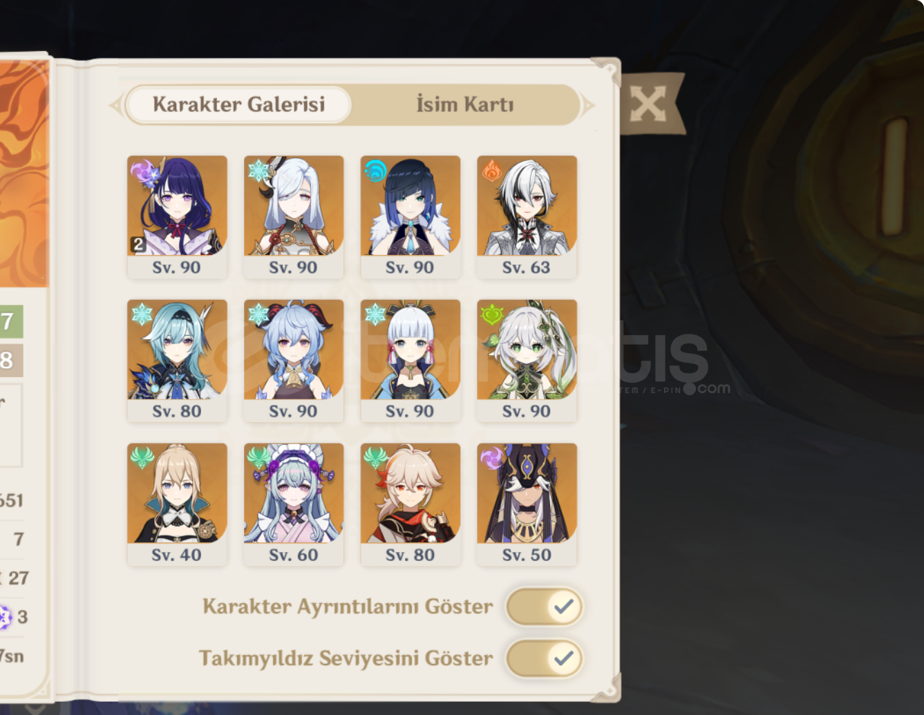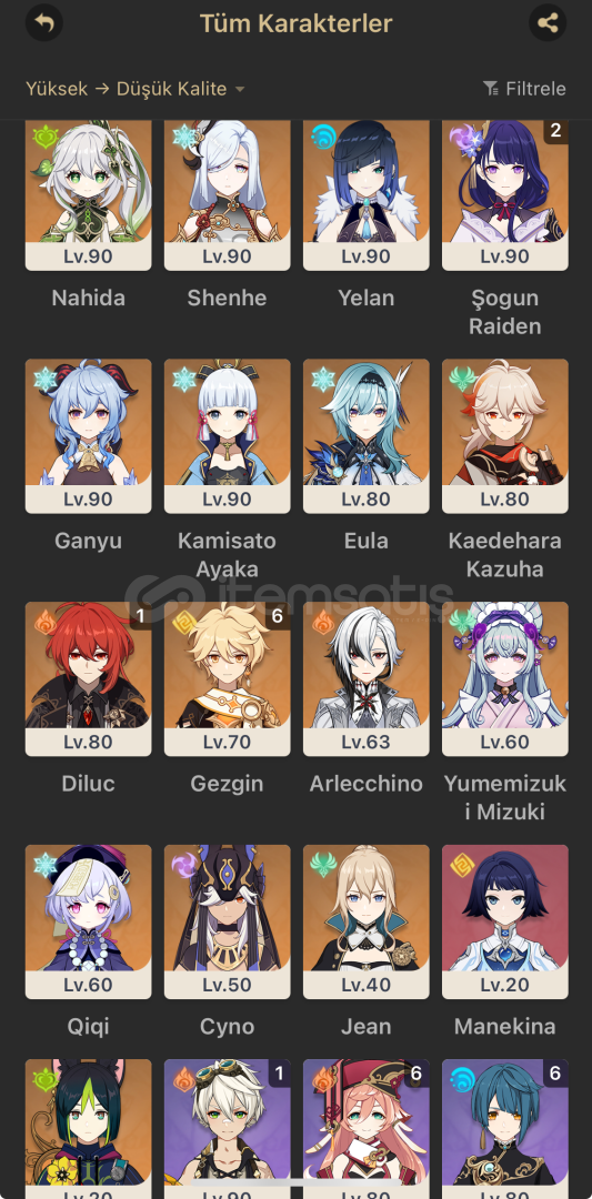 Raiden Shogun C2 - Arlecchino - Kazuha - Yelan - Ayaka- Eula - Nahida - Cyno - Jean - Ganyu - Mizuki - Shenhe - Qiqi - TignariBir çok 4 yıldızlı karakter vardır C6 dır.Natlan 40 Nodkrai neredeyse girilmemiştir.Alana hayırlı olsun.
