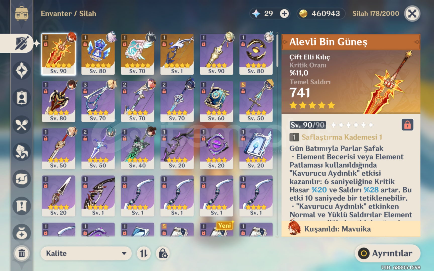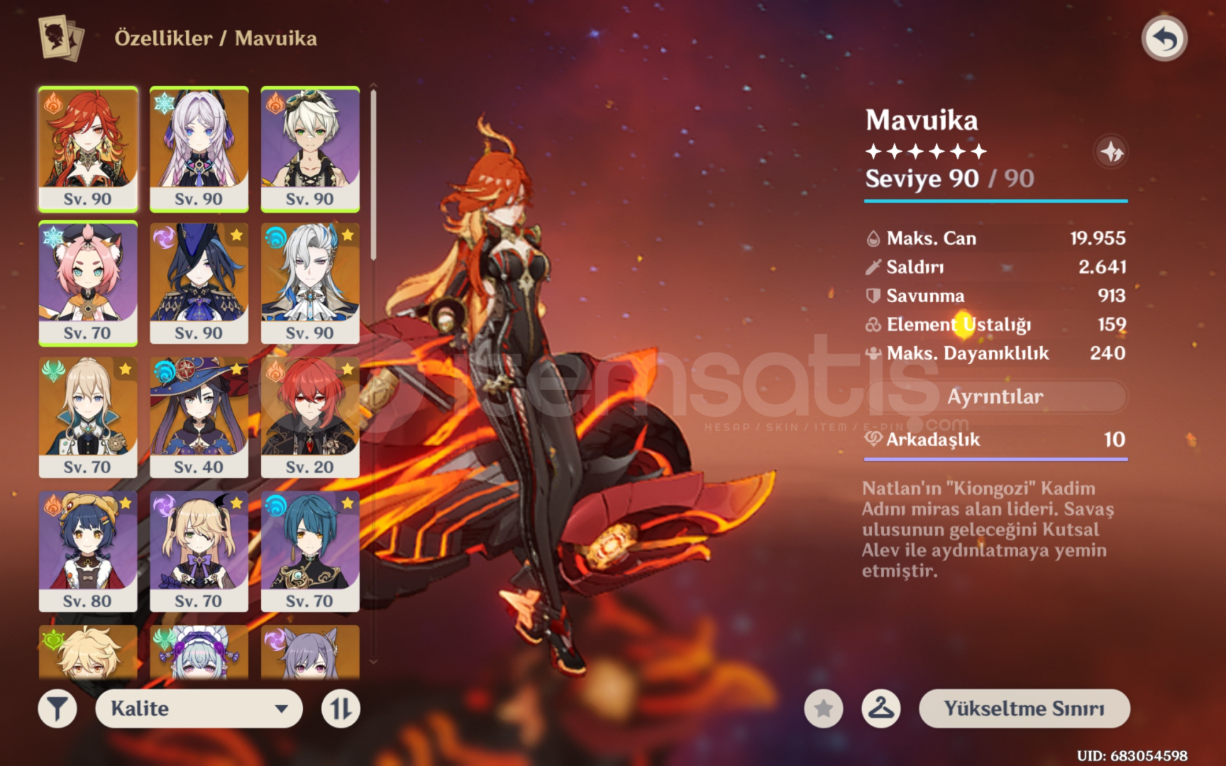 NA. Mavuika ve silahı citlali ve silahı resimdeki 5 yıldızlar68 pity ve rate up karakterde mevcut C6 diona c4 aino gibi 4 yıldız consları bol