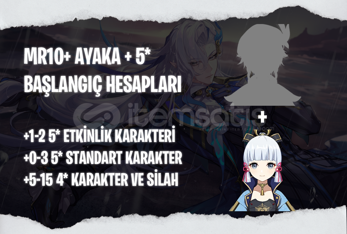 Bu ilanı satın aldığınızda MR10+ seviyesinde içerişinde Kamisato Ayaka + 1-2 adet rastgele 5* etkinlik karakteri bulunan bir hesap tarafınıza iletilecektir.