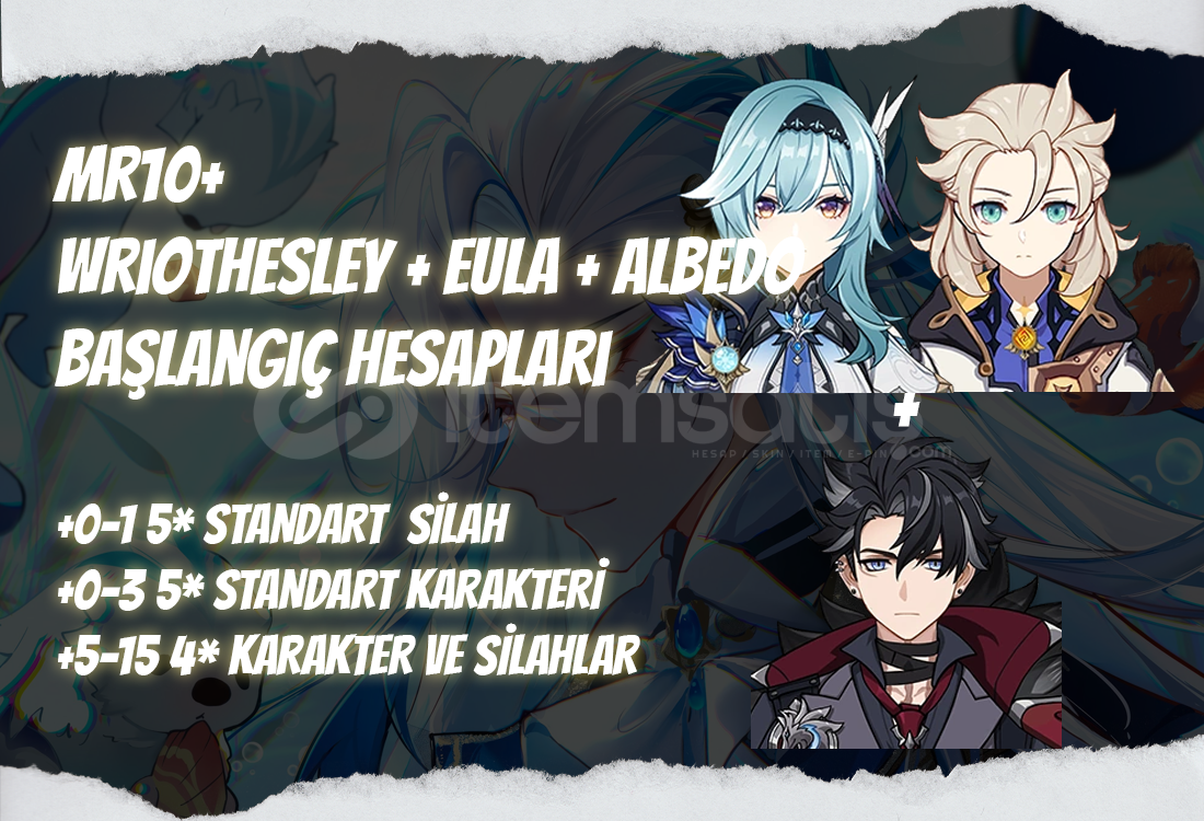 Bu ilanı satın aldığınızda MR10+ seviyesinde içerişinde Wriothesley + Eula + Albedo bulunan bir hesap tarafınıza iletilecektir.Hesapların içerişinde 0-1 adet 5* standart silah içerebilir.Hesapların içerişinde 0-3 adet 5* standart karakter içerebilir.Hesapların içerişinde bir miktar köken taşı bulunabilir.Tüm hes...