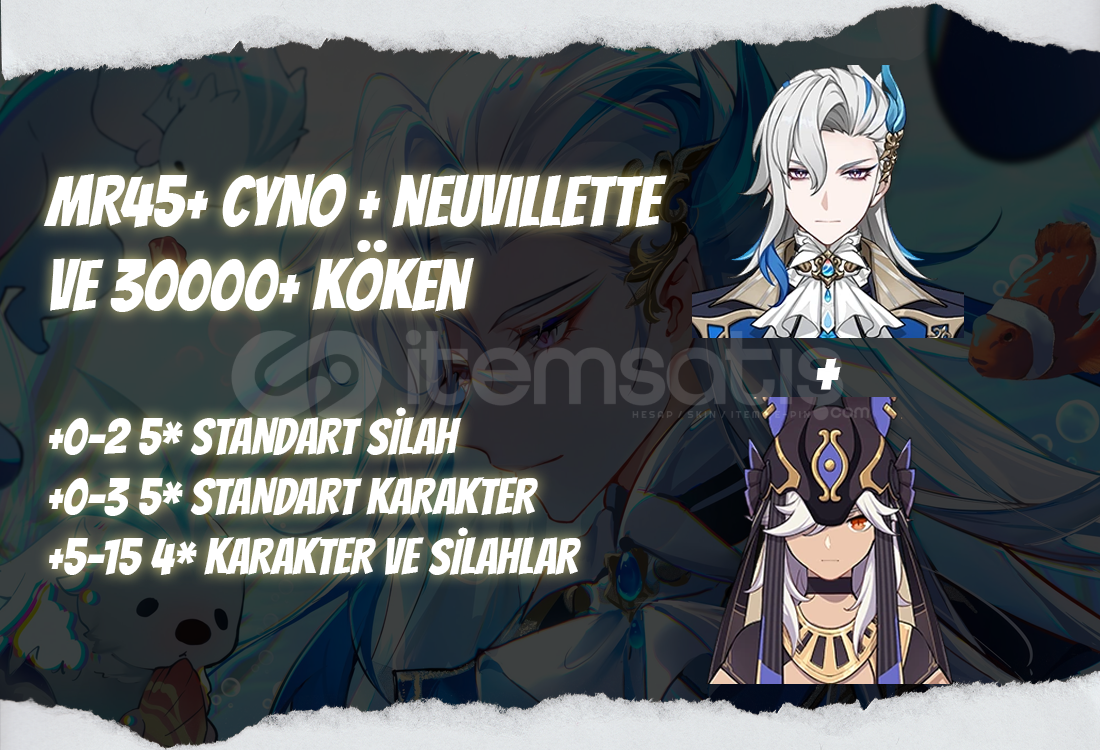 Bu ilanı satın aldığınızda MR50+ seviyesinde içerişinde Cyno + Neuvillette ve ilanda belirtildiği kadar Köken taşı bulunan bir hesap tarafınıza iletilecektir.Hesapların içerişinde 0-2 adet 5* standart silah içerebilir.Hesapların içerişinde 0-3 adet 5* standart karakter içerebilir.İlanda yazan Köken taşı say&#...