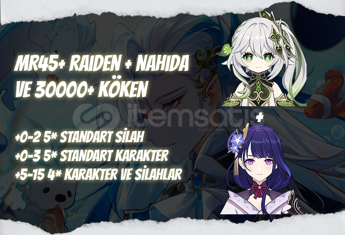 Bu ilanı satın aldığınızda MR50+ seviyesinde içerişinde Raiden + Nahida ve ilanda belirtildiği kadar Köken taşı bulunan bir hesap tarafınıza iletilecektir.
