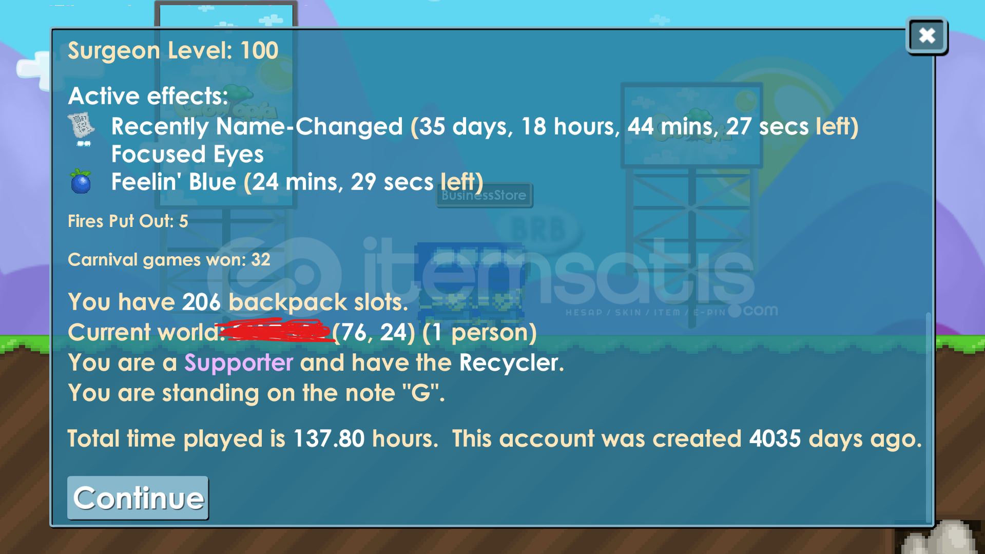 📝 Details~ Focused Eyes~ Bu Sezon Growpass açıktır ✅~ EMT Jumpsuit~ 54 Growtoken~ Gemini Ring~ Ring Of Smithing~ Fishing Wader Boots~ Munchin Straw~ 14x Wolf Ticket~ 5x Soul Stone~ 17x Macn Cheese Star~ 1x Legendary Clash key~ 20x Grow Voucher~2x Deluxe World Sprey~ 4035 Days~ 140 Hours~ Ready Change Name ❌ (35 Days)~ Ready Change Email ✅