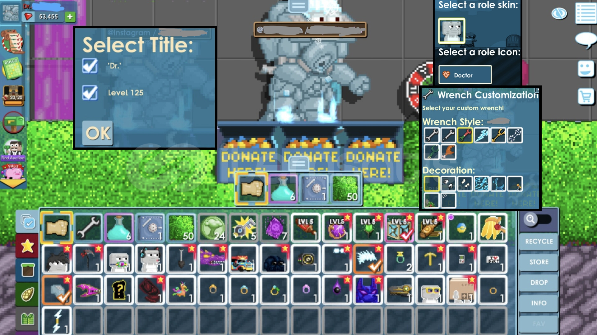Bilgiler:~Legacy Girişli ~Super Supporter~Ready Change Name ~125 Level~Dr. Title~Legendary Dragon~Legendary Bot~Anubis~Focused Eyes ~Golden PickAxe~Anime Hair~Meow Ear's~Digger's Spade~Atomic Shadow Scythe~Evil Space Helmet~Frosty Hair~Seil Orbs~Tactical Stealth Espionage Device~Growboy~Easter Jeepney~Mothman Wings~Mercy Wings~5 Level Blue Ances~5 Level Red Ances~5 Level Purple Ances~5 Level Yellow Ances~5 Level Green Ances~Zeus~Özel Wrench Stilleri~Özel Roles Yüz Ve İko...