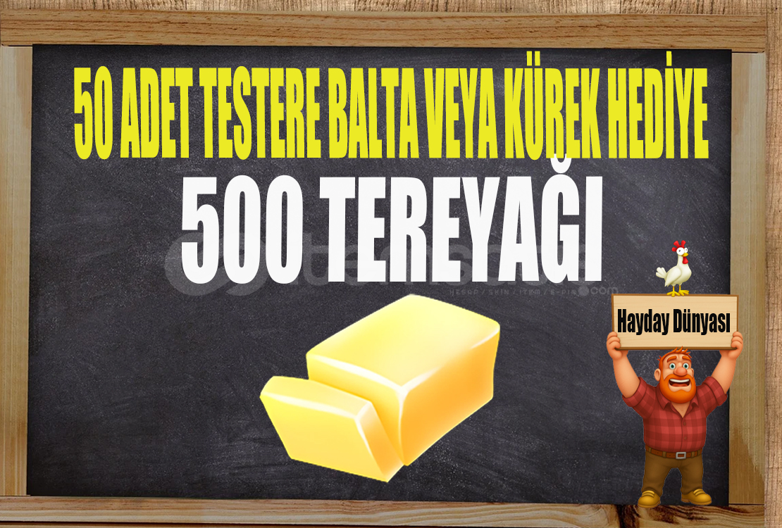 ✅500 ADET TEREYAĞI(LEVEL 9) 1 ALTINDAN DİZİLİR🎁 Hediye için dilediğiniz Testere,Kürek,Balta hangisiden istiyorsanız 50 adet veriyoruz dilerseniz karışıkta yapabiliriz toplam 50 adet olacak şekilde✅Önce bize oyundaki etiket kodunuzu yazıyorsunuz✅Bize etiketinizi verdikten sonra size arkadaşlık isteği atıyoruz✅Sipariş verdiğiniz malzemelerinizi ürün farket...