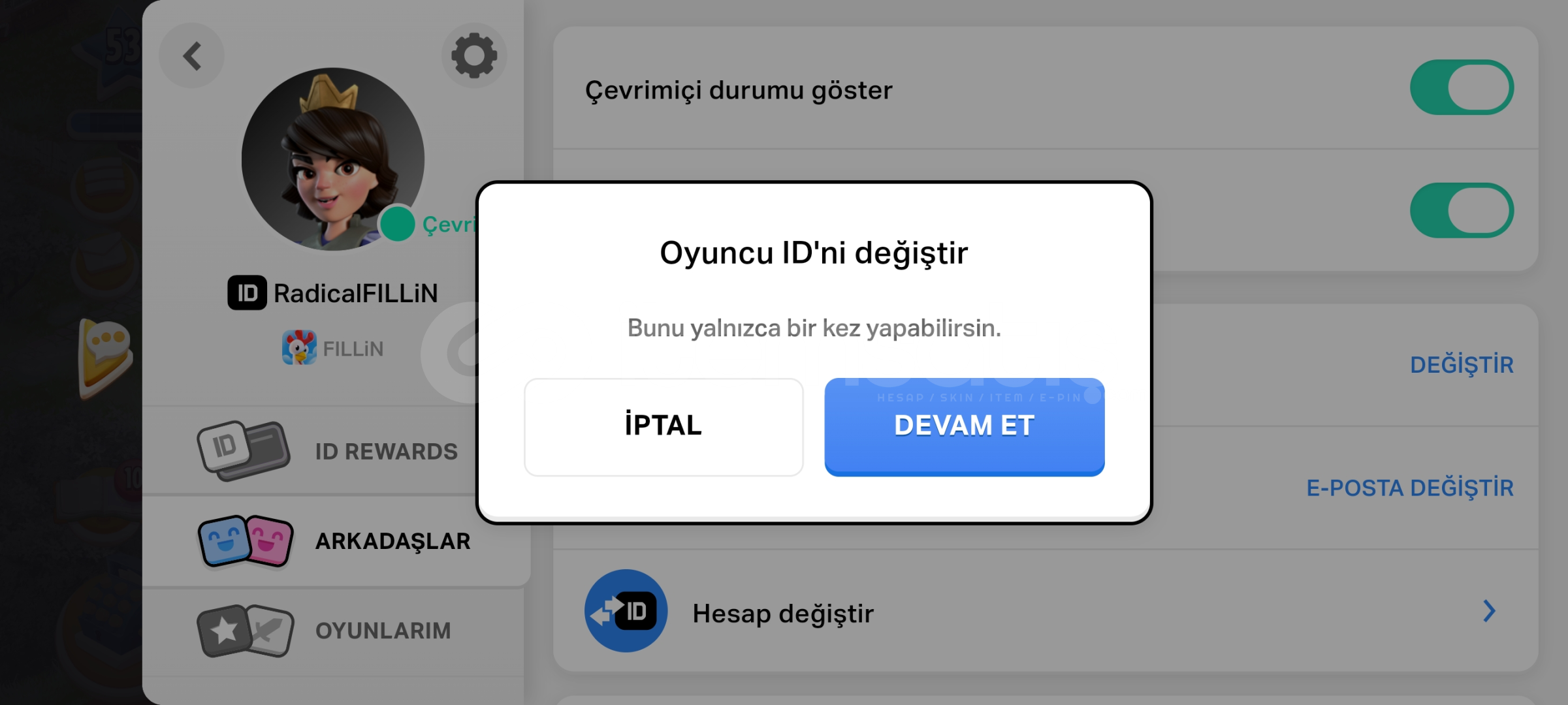 1 TANE SUPERCELL İD DEĞİŞTİRME HAKKI VARDIR.