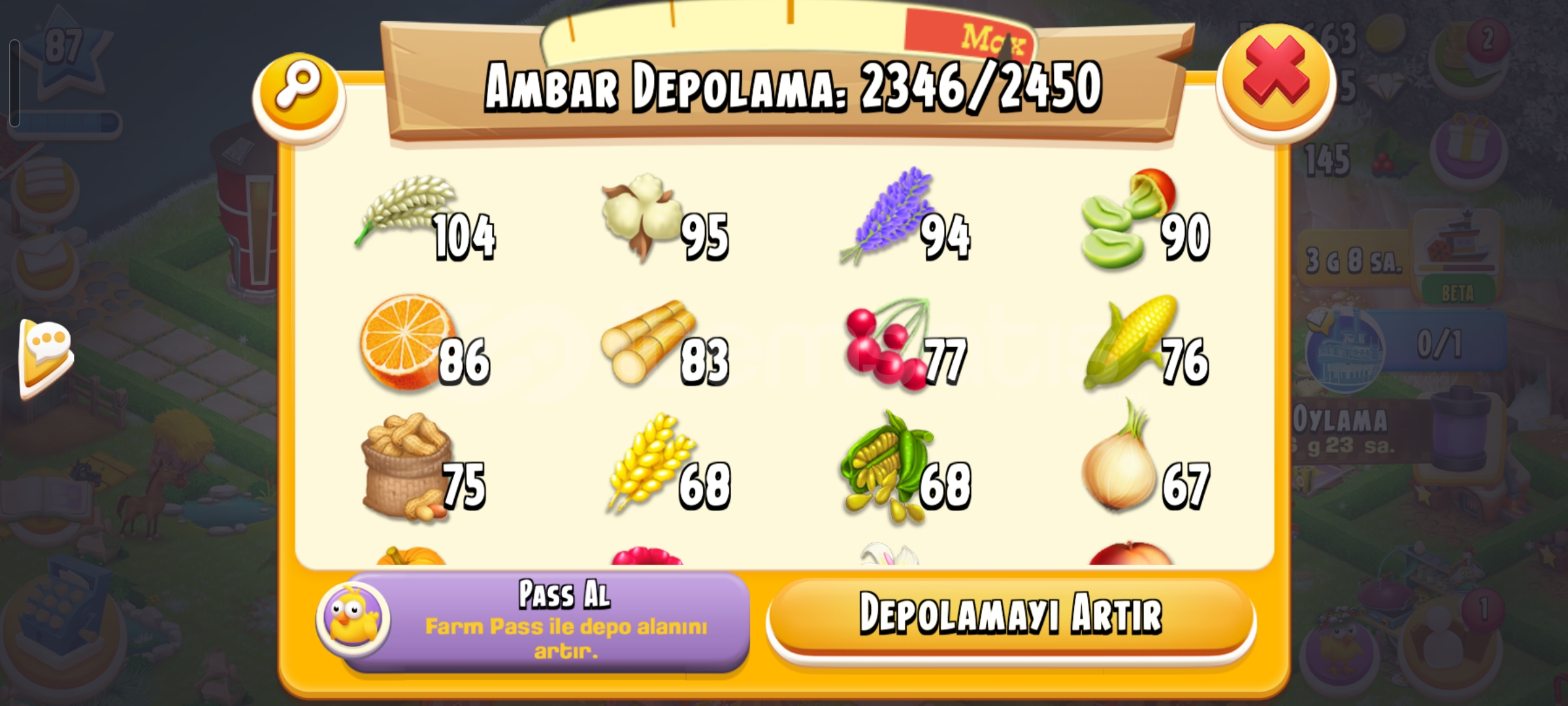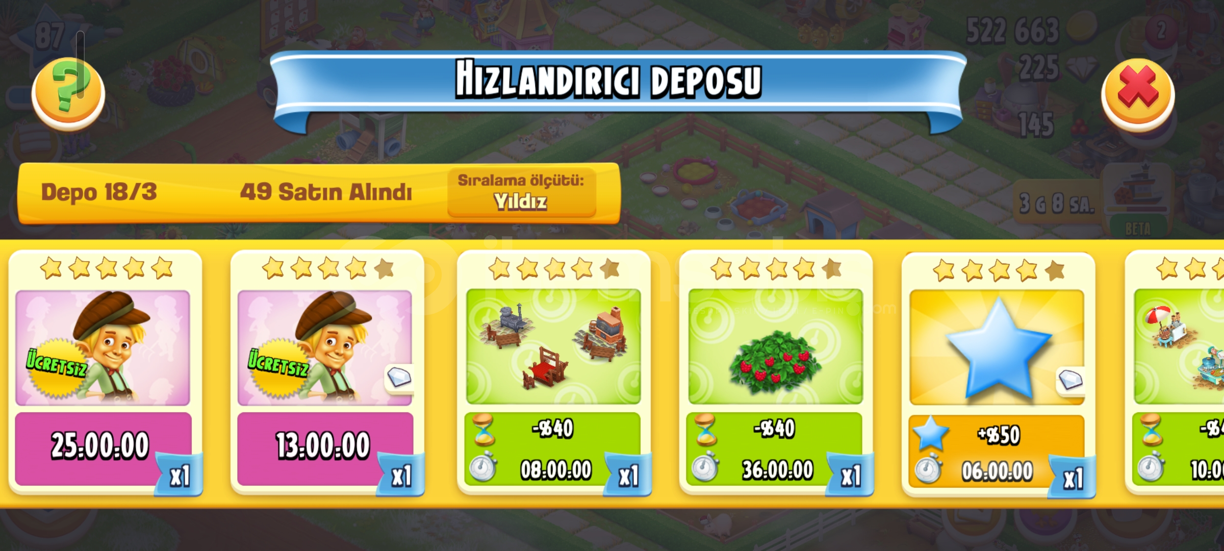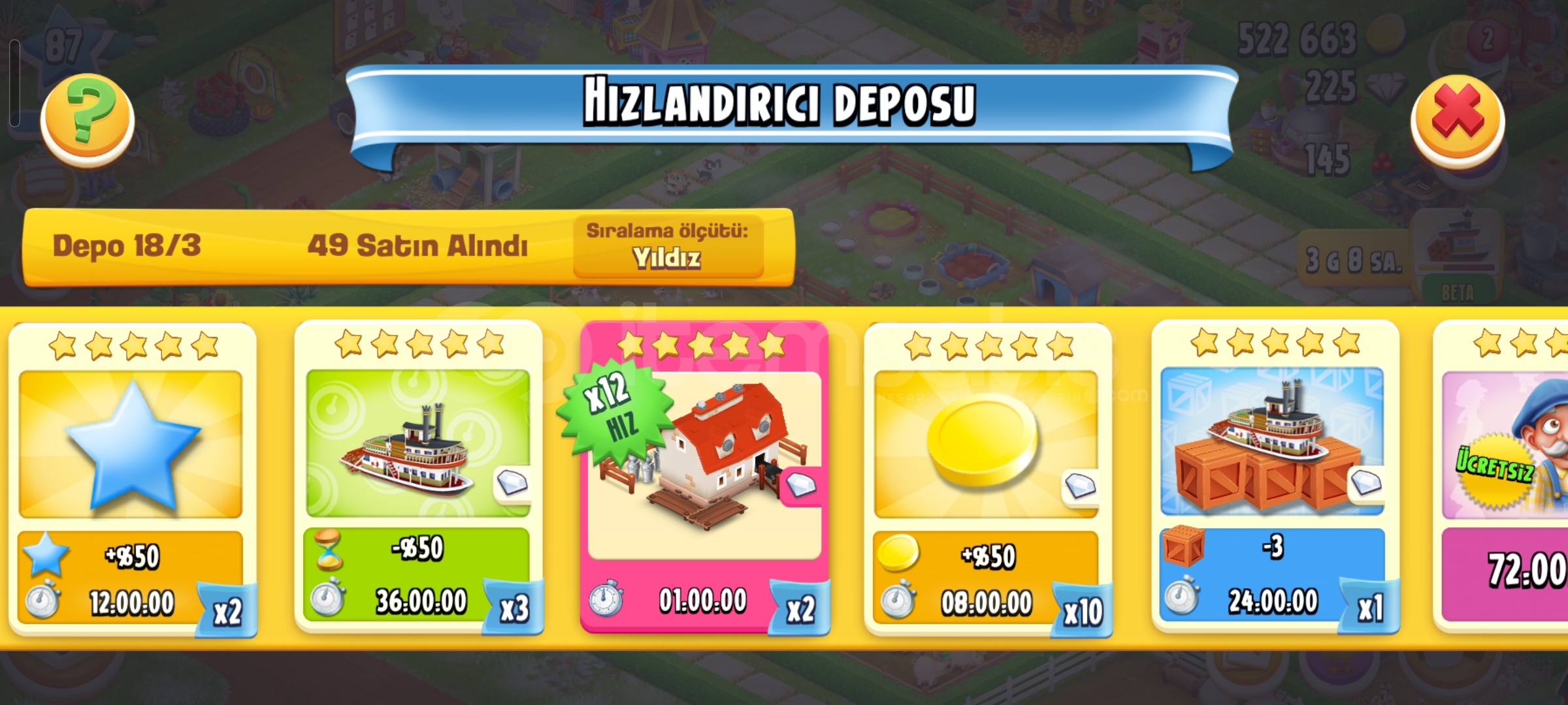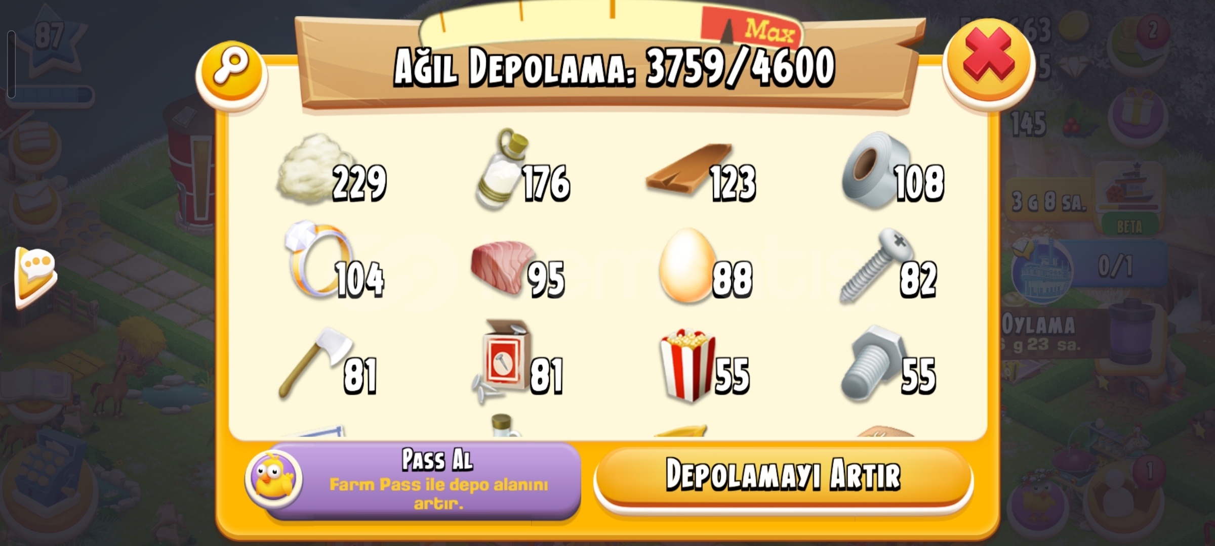 Emek hesaptır87 seviye4600 ağıl2450 ambar225 elmas vardır34 adet evcil hayvan67 adet hızlandırıcıHesap koruması aktiftirGeri çekilmeme garantili sorunsuz hesaptır.