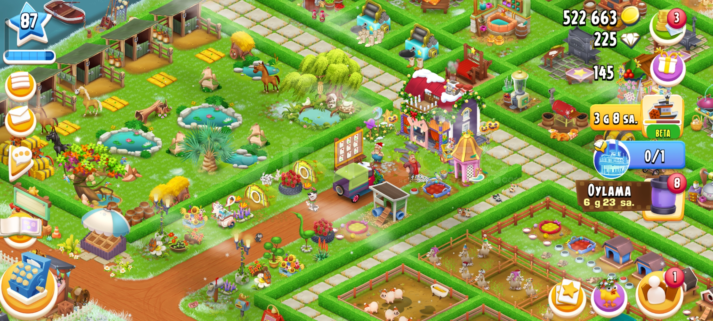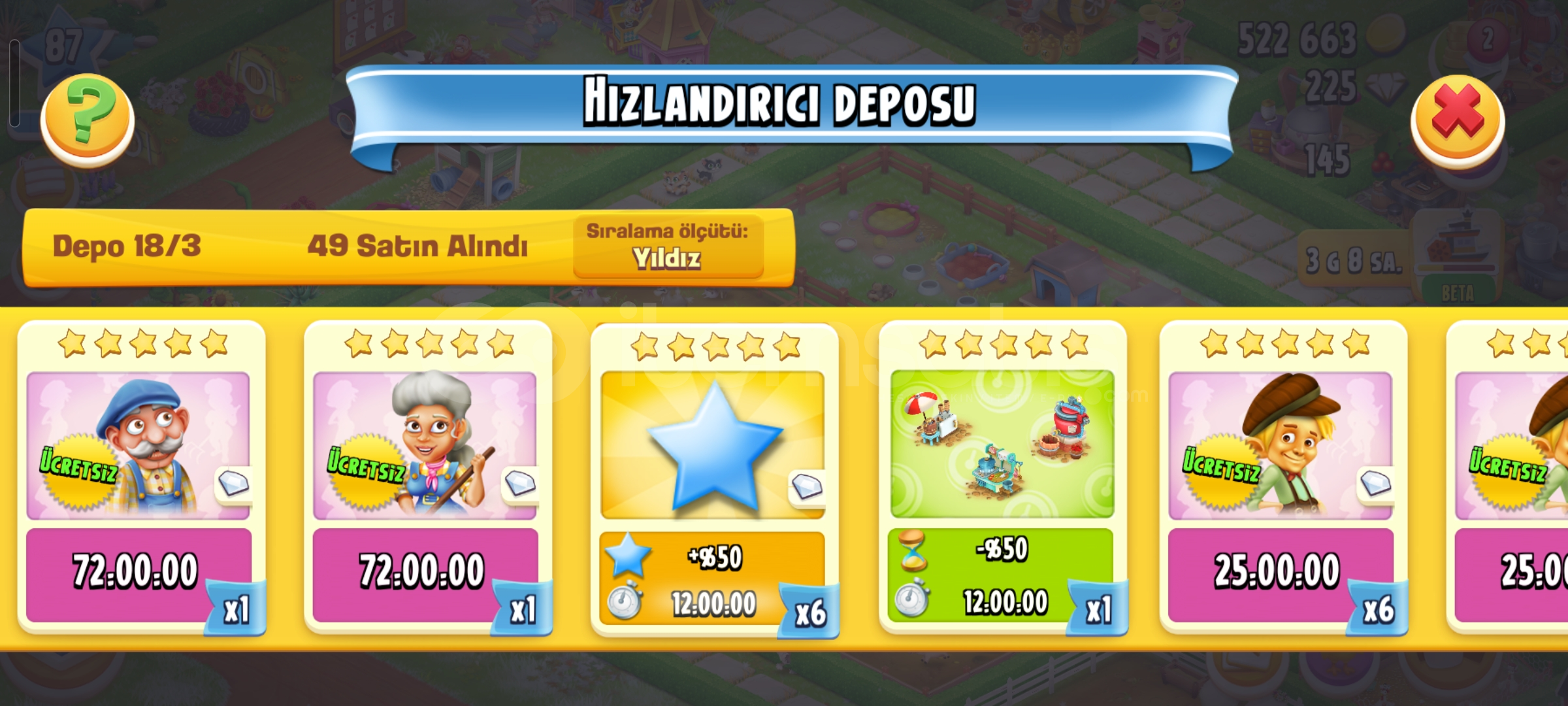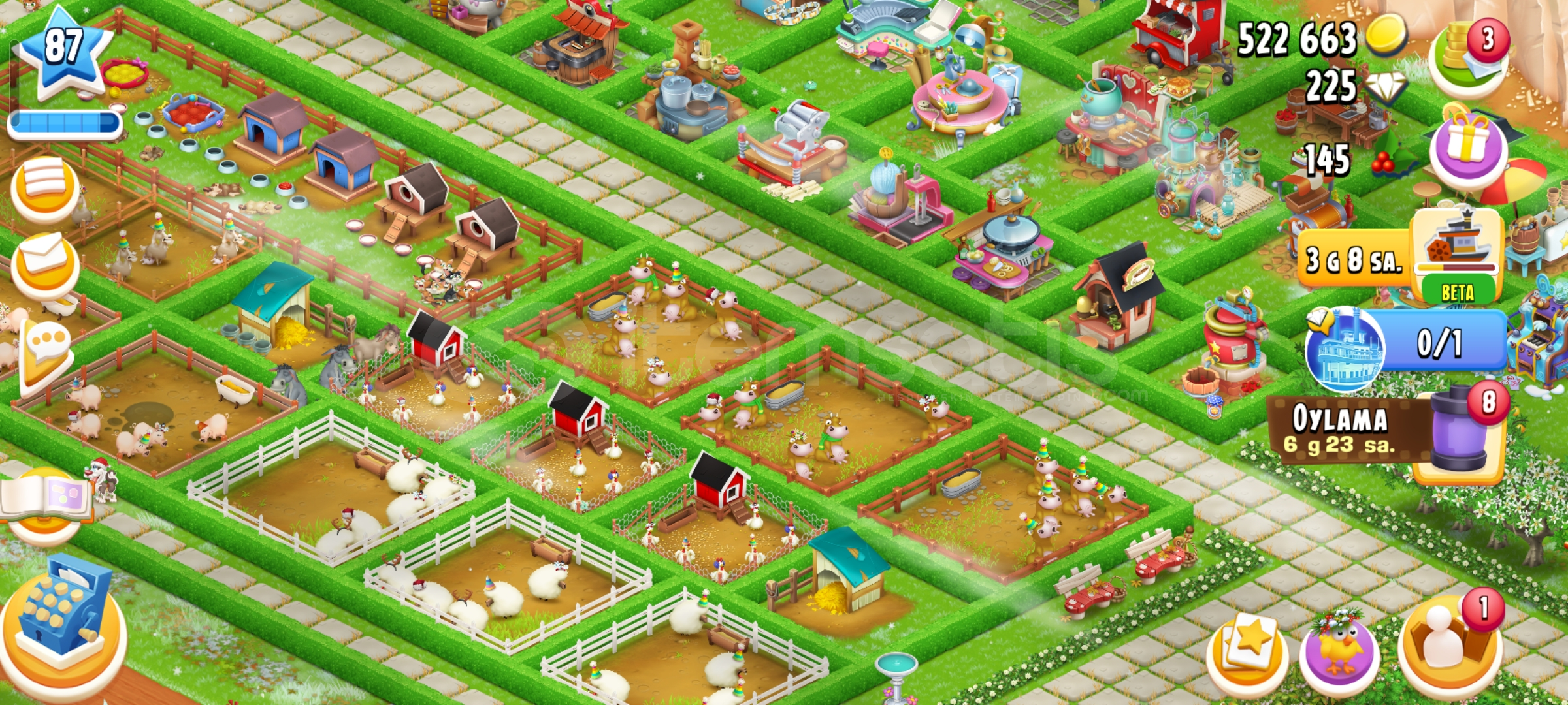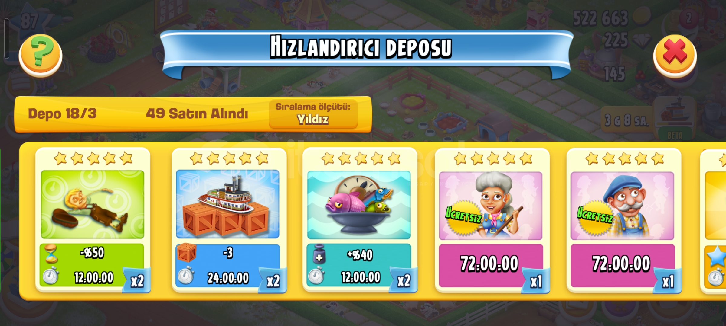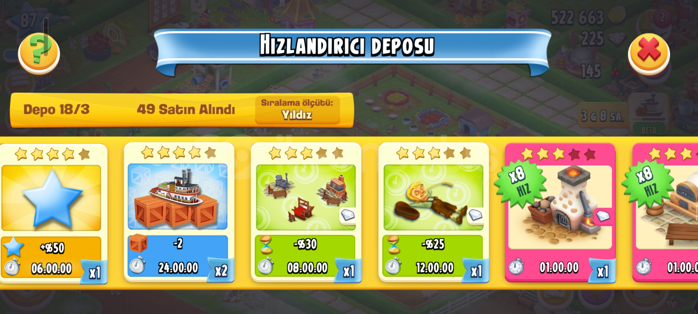 Emek hesaptır87 seviye4600 ağıl2450 ambar225 elmas vardır34 adet evcil hayvan67 adet hızlandırıcıHesap koruması aktiftirGeri çekilmeme garantili sorunsuz hesaptır.