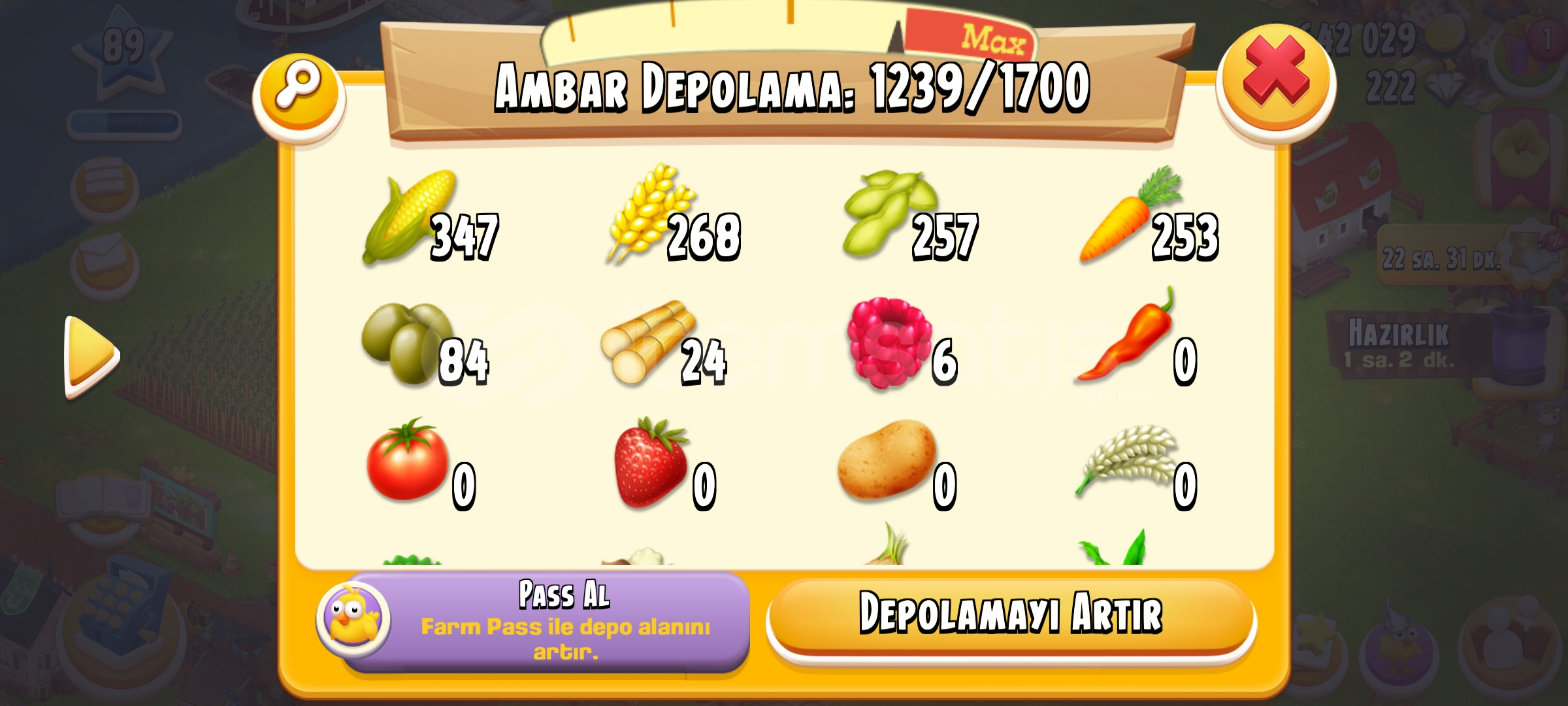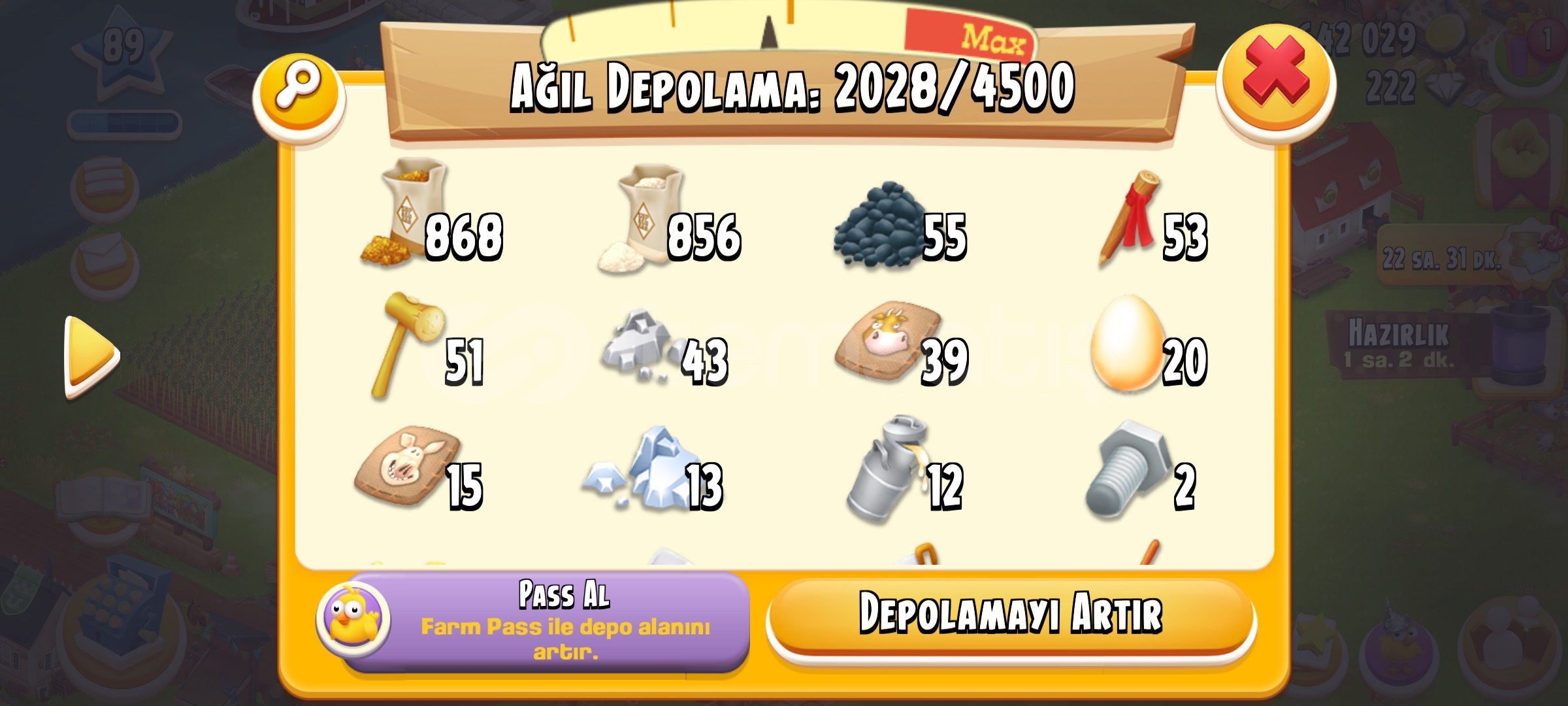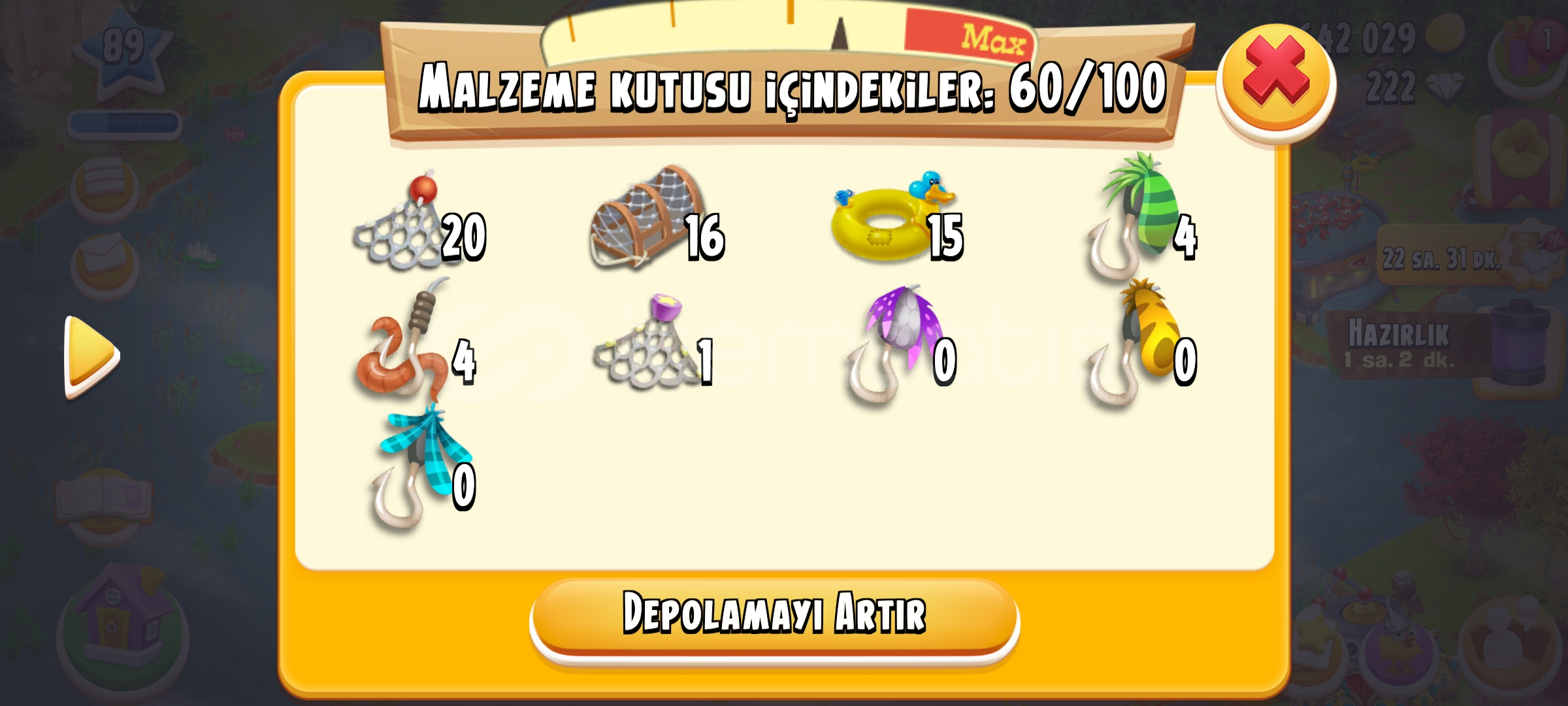 4500 ağıl 1700 ambar kapasitesi Balık bölgesi açık Kasaba 10.seviye