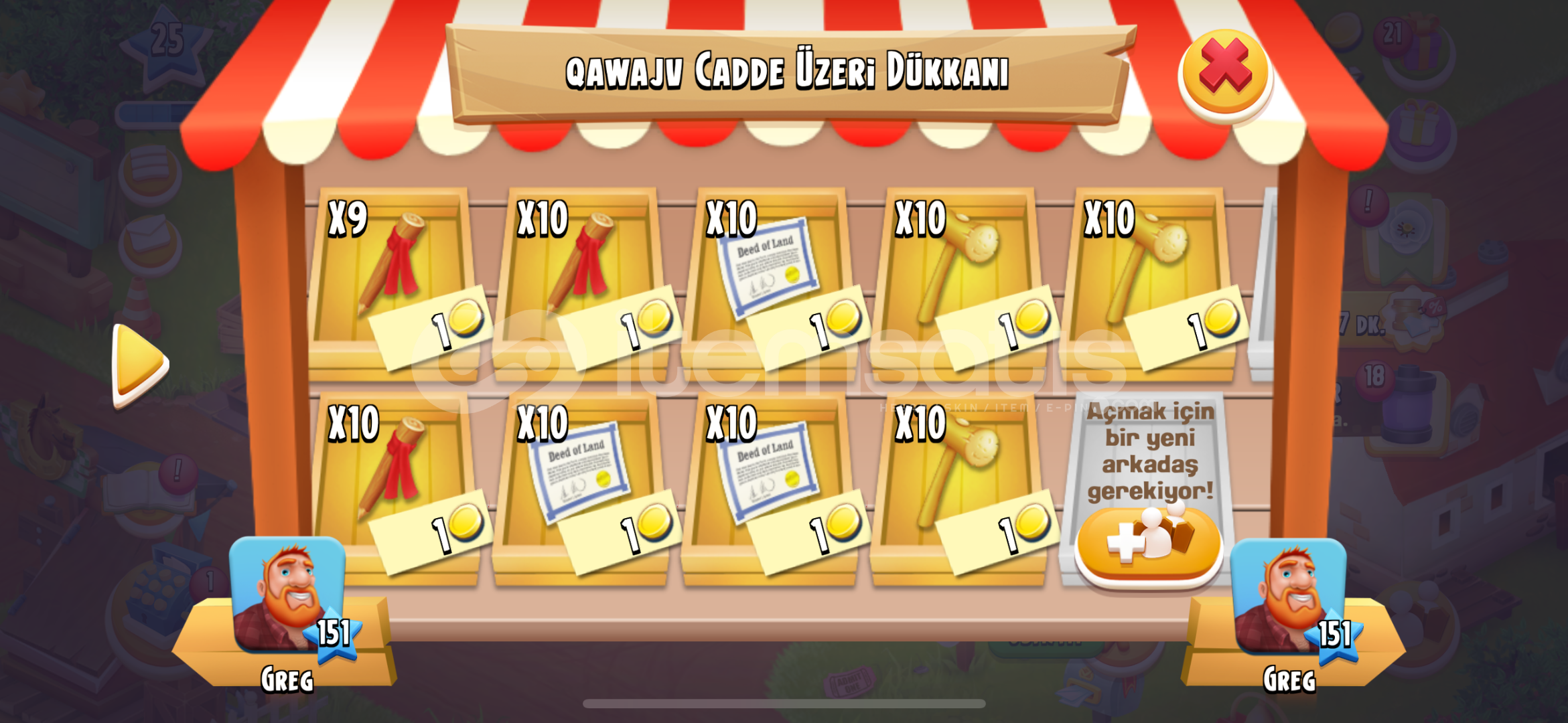89 Adet Arazi Malzemesi29 Kalem/30 Tapu /30 TokmakArkadaşlık kodunuzu iletip beklemeniz yeterlidir.Siz aldıktan sonra sizi arkadaş ekleyip markete Diziyoruz siz alıyorsunuz. Hepsini almak için pazara dizilen ürünleri önce 9 adet olanı, ardından 10’lu paketleri almalısınız.Market tezgahında kalan ürünler için hak talep edilemez. Günlük alım limitiniz dolmuşsa sorumluluk size ait...