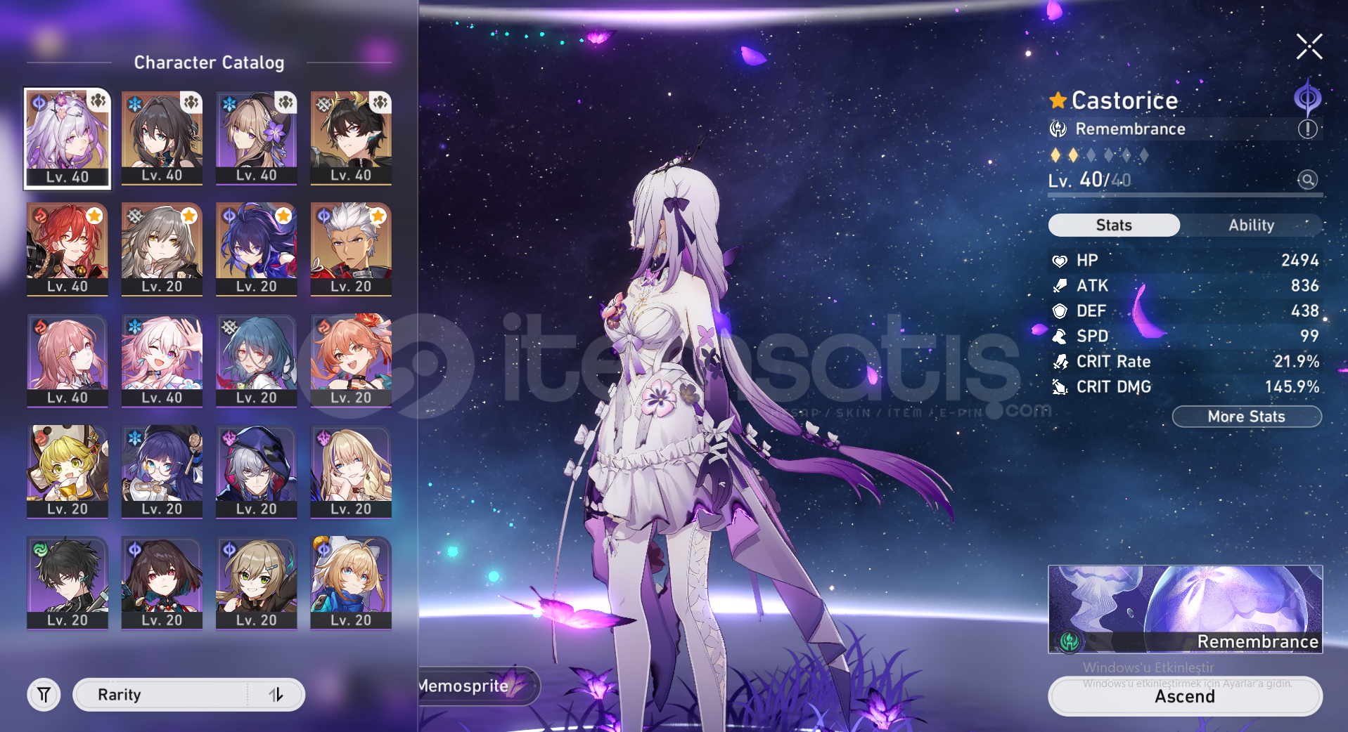 Merhaba hesapta:Süreli Karakter Banner: 0 pityStandard Banner: 69 pityEU (Avrupa) sunucusunda. Hikaye Jarilo-VI'de. Dolu dolu içerik vardır. 27 TL hesaptır. Castorice'in 5* eserleri vardır.