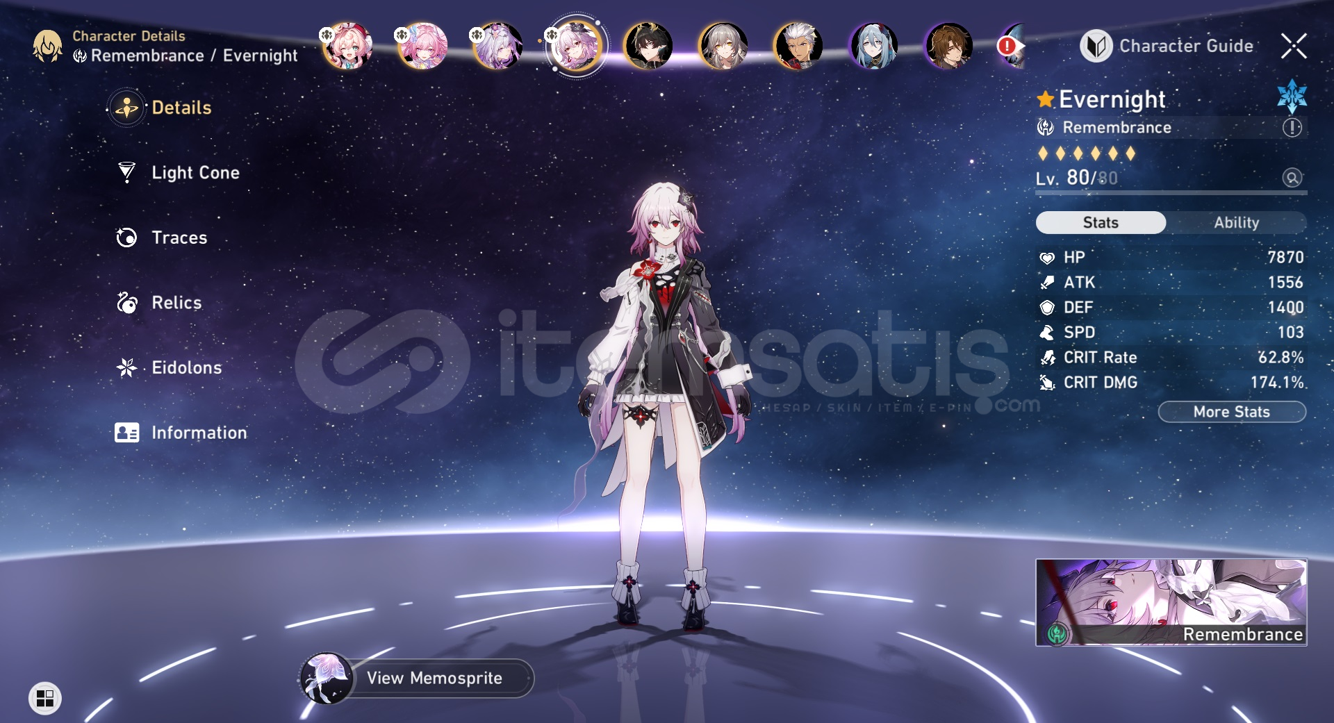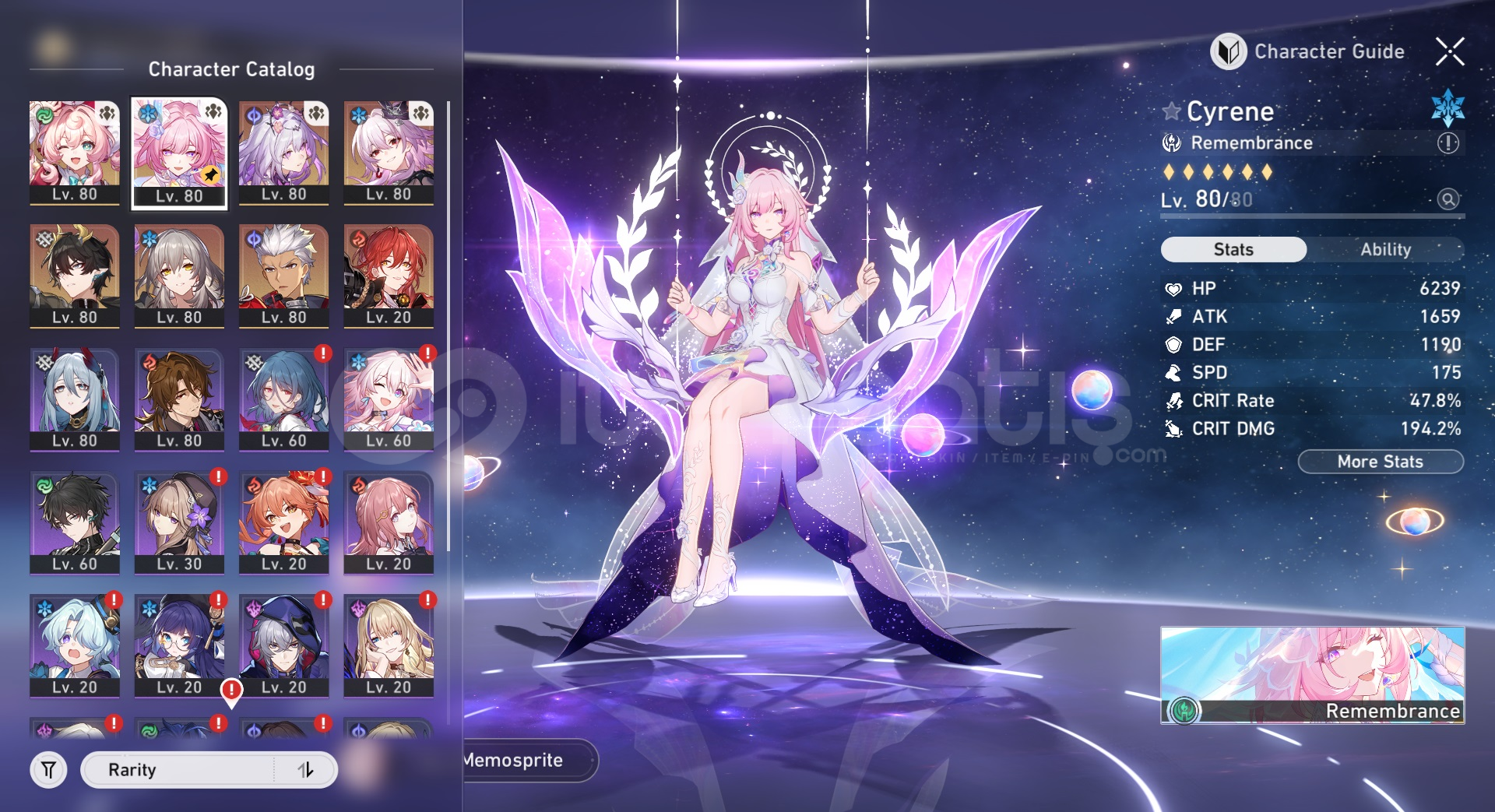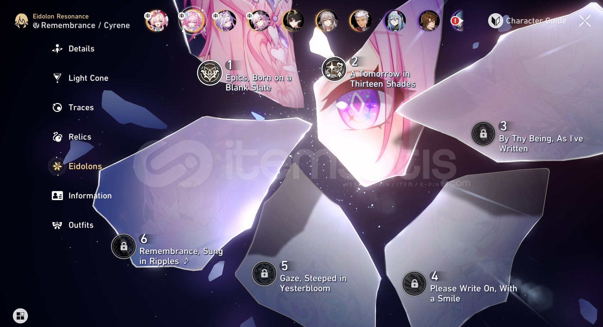 Hepsi kasılı kendi lightcone'larıyla limited karakterler olan endgame hesabım. -E2S1 CYRENE E0S1 CASTORICE E0S1 EVERNIGHT E0S1 HYACINE PERMANSOR TERRAE RUAN MEI ARCHER Ayrıca limited karakter banner 70 pull içerde şu anda soft pityde.