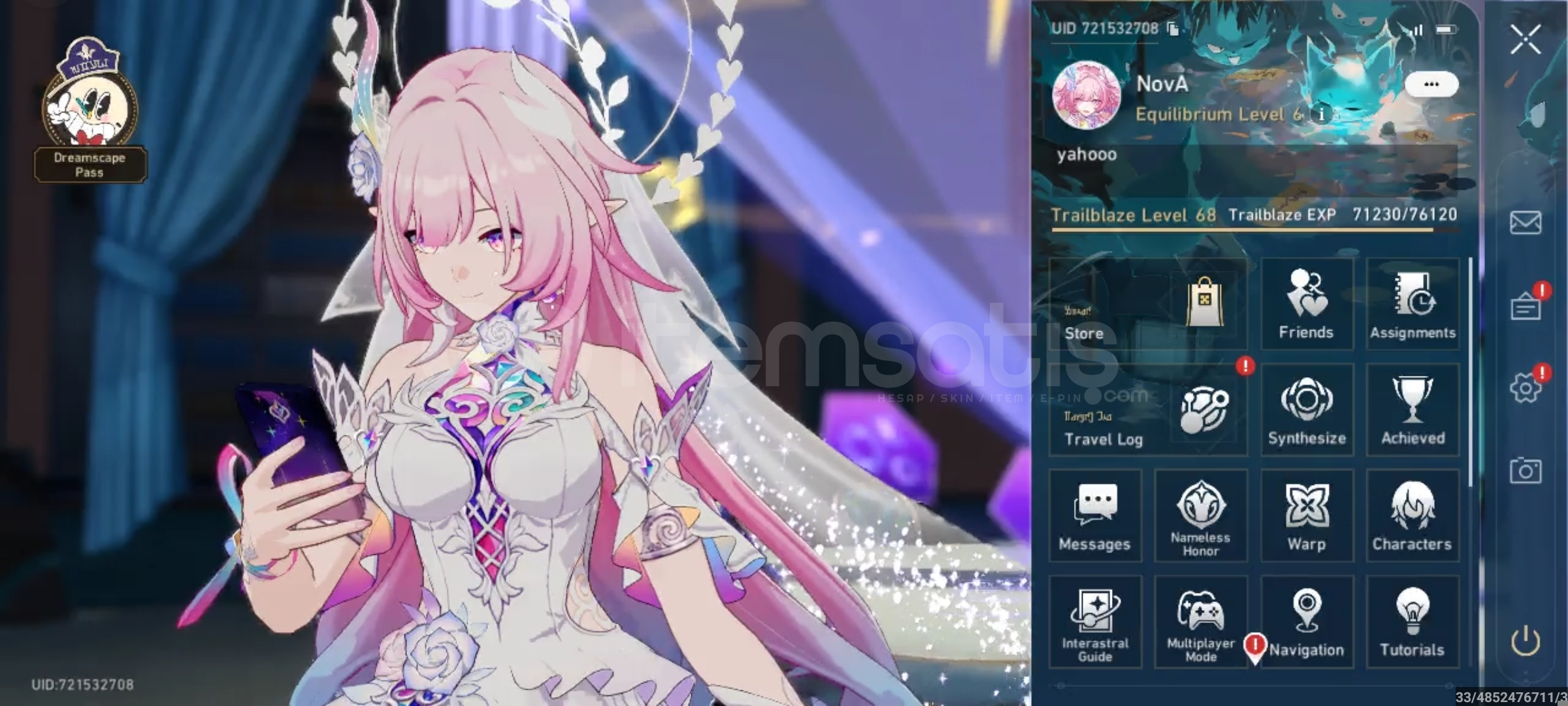 hesap seviyesi 68 ve tam mainlik hesaptır oyunun tüm ana hikaye görevleri yapılmıştır.