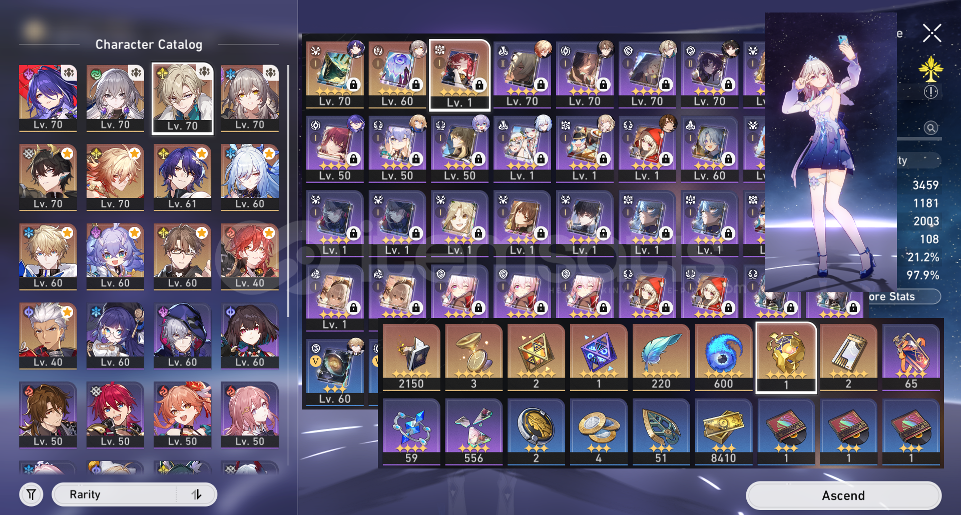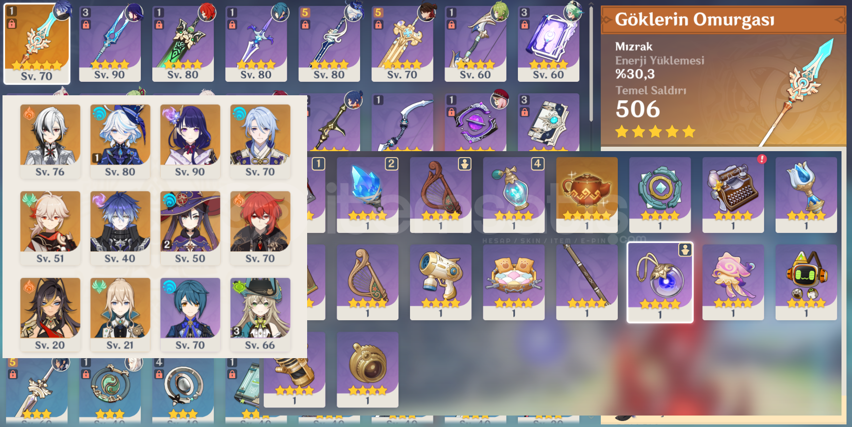 Genshin İmpactAR55 EuC1 FurinaArlecchinoShogun RaidenKamisato AyatoFlinsKaedehara KazuhaC2 MonaDilucDehyaJeanGöklerin omurgası mızrakXingqiu ve Kirara skin mevcutAna hikaye SumerudaÇoğu yan hikaye yapılmadı Harita keşif oranları çok düşük Kadim deniz Natlan ve Nod Krai hiç girilmedi21 Reçine mevcutMinik peri aygıtı-eflatun rengi mevcutDoğum günü girili rate up yokHonkai Star Rail...