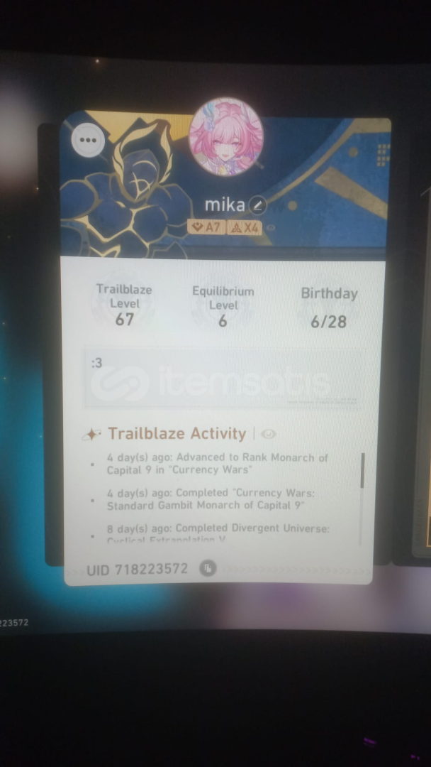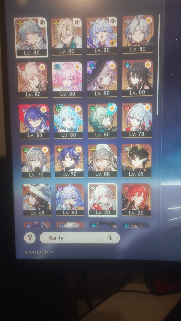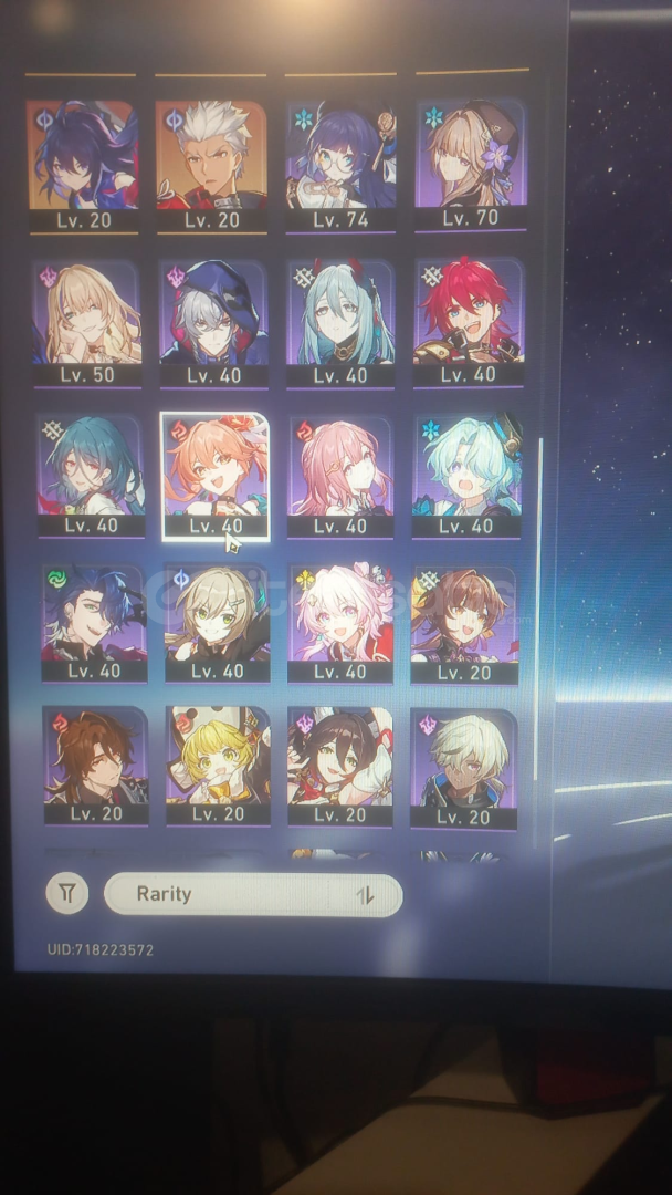 Extrabilgi isterseniz DM'den ulaşabilirsiniz☆Hesapta bir çok karakter bulunmaktadır, pity 37, jade kasılabilecek birçok kaynak (görevler, etkinlikler, dünya keşfi) bulunmaktadır.5☆lı Karakterler:DahliaAcheronRobinAventurinePhainonJiaoqiuCyreneThe HertaRuan Mei (E1)AnaxaSundayTopazDr. RatioCerydraBronya (E2)Dan Heng • Permansor TerraeHimekoSeele(E1)BailuClaraArcher4☆lı karakterler(yalnızca consu olanları y...