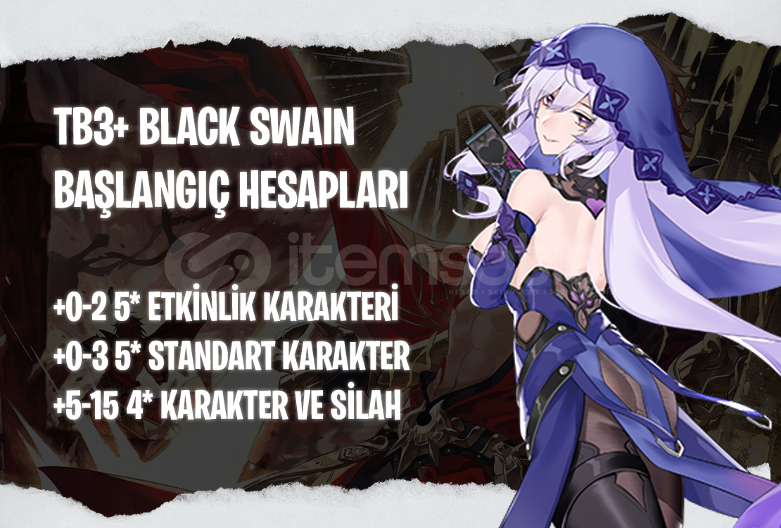 Bu ilanı satın aldığınızda TB3+ seviyesinde içerişinde Blac Swan bulunan bir hesap tarafınıza iletilecektir.Hesapların içerişinde 0-3 adet 5* standart karakter içerebilir.Hesapların içerişinde bir miktar Steallar Jade bulunabilir.Tüm hesaplarımız garantilidir  ve alım sonras eposta veya kullanıcı adı ş...