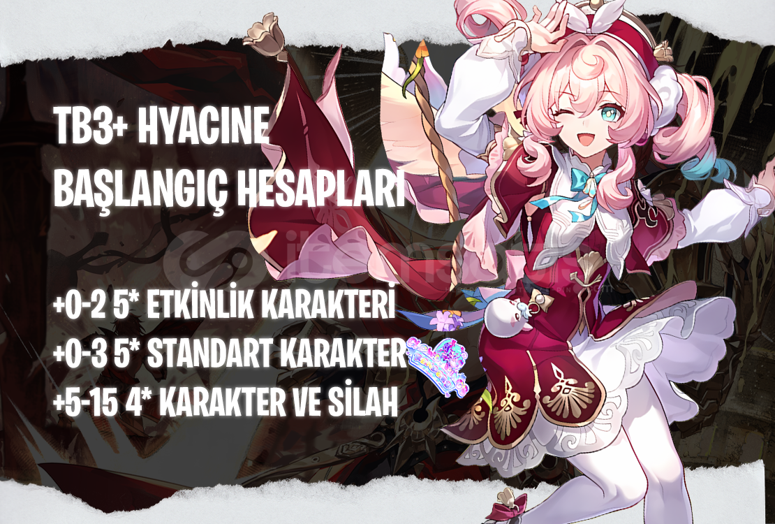 Bu ilanı satın aldığınızda TB3+ seviyesinde içerişinde Hyacine bulunan bir hesap tarafınıza iletilecektir.Hesapların içerişinde 0-3 adet 5* standart karakter içerebilir.Hesapların içerişinde bir miktar Steallar Jade bulunabilir.Tüm hesaplarımız garantilidir  ve alım sonras eposta veya kullanıcı adı şi...