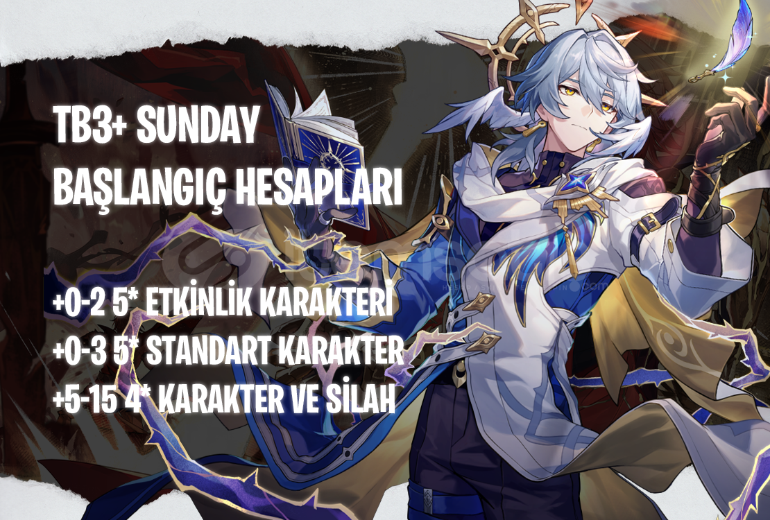 Bu ilanı satın aldığınızda TB3+ seviyesinde içerişinde Sunday bulunan bir hesap tarafınıza iletilecektir.Hesapların içerişinde 0-3 adet 5* standart karakter içerebilir.Hesapların içerişinde bir miktar Steallar Jade bulunabilir.Tüm hesaplarımız garantilidir  ve alım sonras eposta veya kullanıcı adı şif...