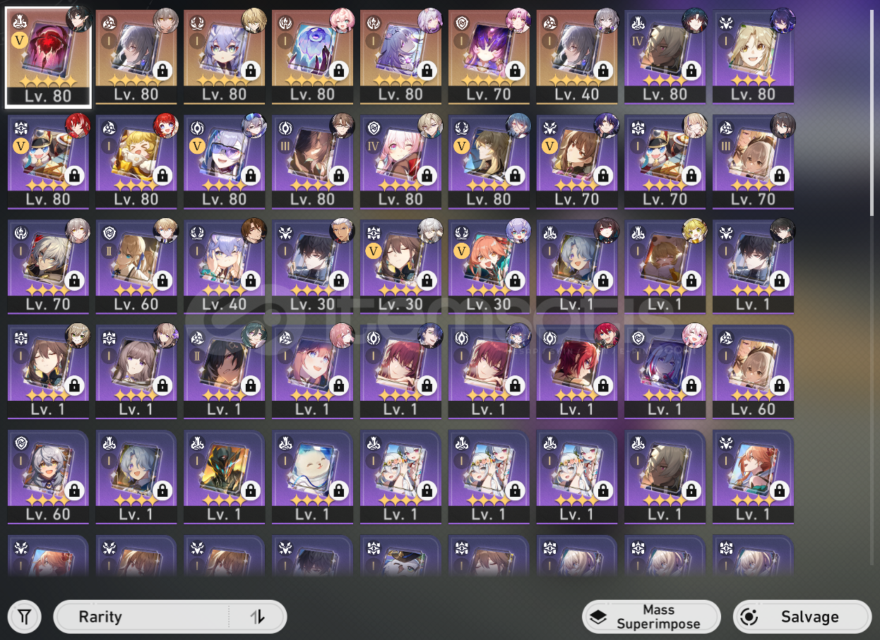 Karakterler ve Light Conelar görüldüğü gibi. 6-7 M credisi vardı sanırsam bayağı da mor expsi var. Pitysi 30-40 gibi. Hyacine çıktı en son. Farklı bir hesap aldığımdan satıyorum.