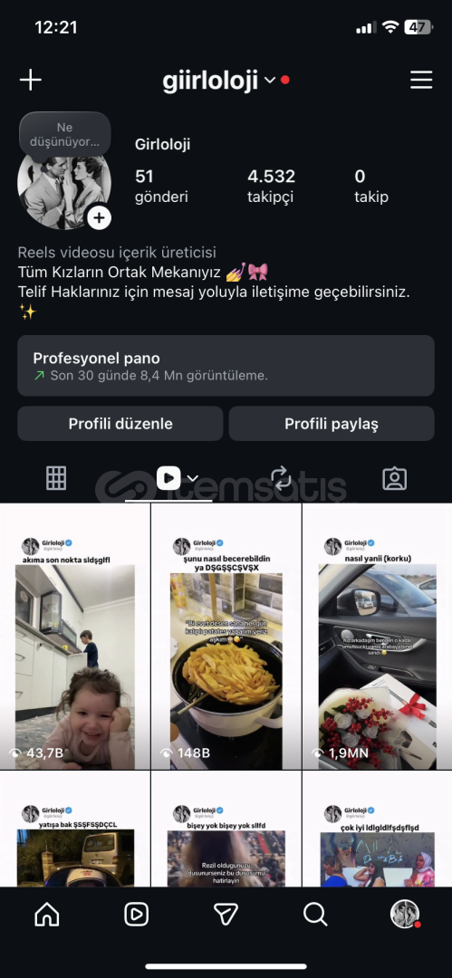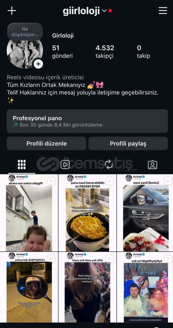 BU ÜRÜNÜ SATIN ALAN DEĞERLİ MÜŞTERİLERİMİZ :Fotoğraf / Video Atınız (Hikaye olarak paylaşılacaktır)Paylaşılacak Sayfa : giirlolojiGönderi olarak paylaşım için 2 kere ilanı satın almalısınız4500 Gerçek, Aktif hesaplardır.Son 30 Günde +8.5 Milyon erişilen hesap bulunuyor.İstediğiniz video,text,konuşmayı paylaşabilirs...
