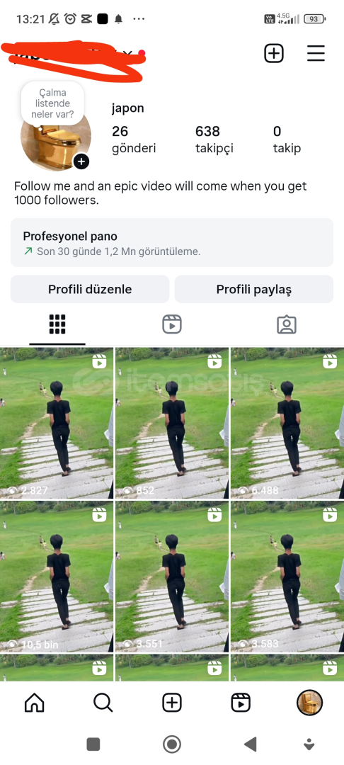 Hesap her dakika takipçi yükseliyor yarisi türk yarısı yabancı karışık 100-200 arası at goruntulenme