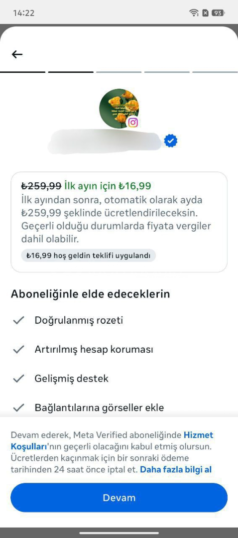 META VERIFIED için alacak kişinin, abonelik satın aldıktan sonra: (Hesapta herhangi bir değişiklik yapılmalıdır.)