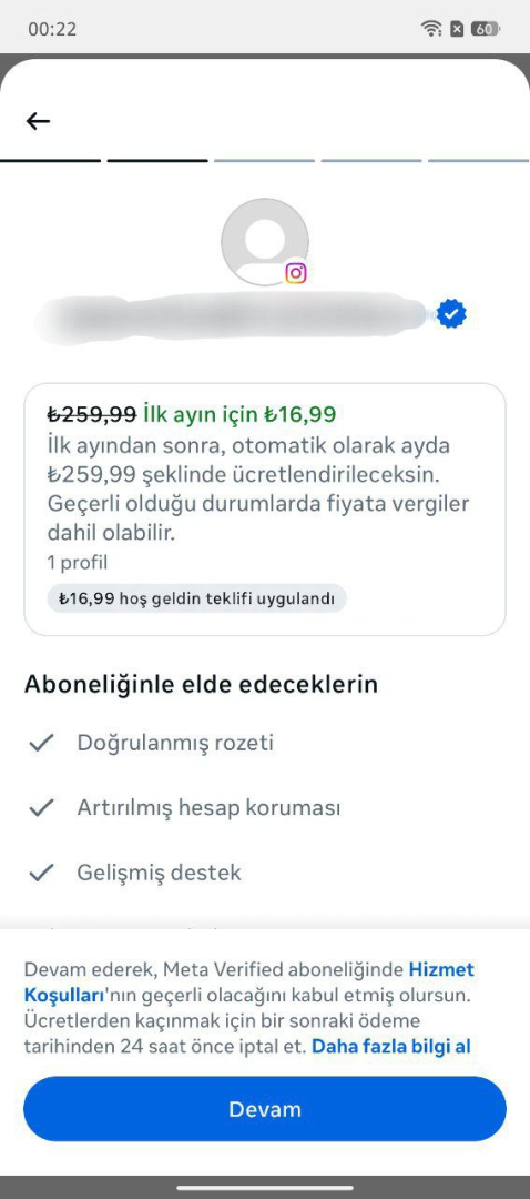 • META VERIFIED için alacak kişinin, abonelik satın aldıktan sonra: (Hesapta herhangi bir değişiklik yapılmalıdır.)