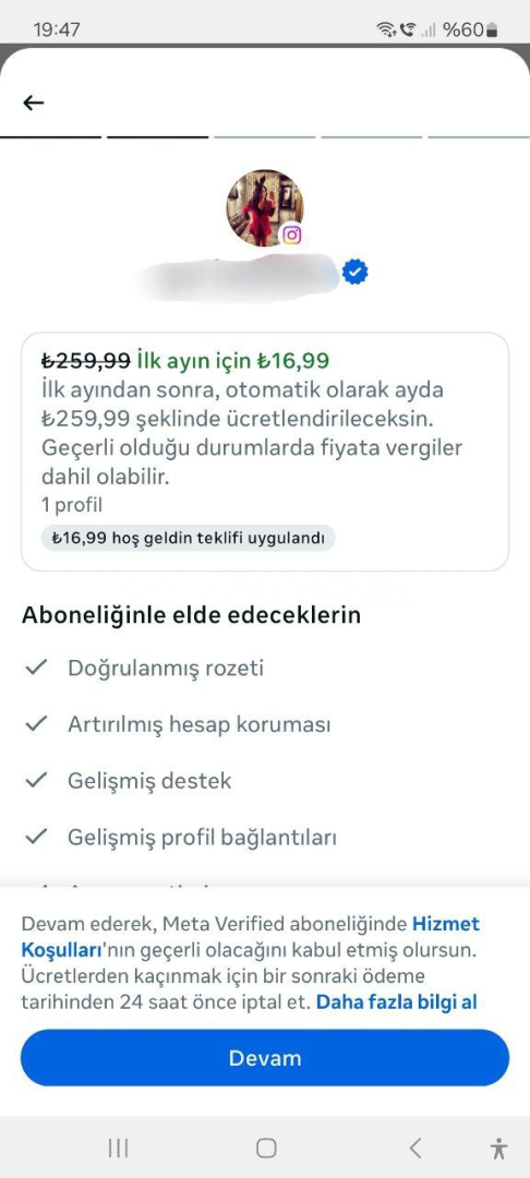• META VERIFIED için alacak kişinin, abonelik satın aldıktan sonra: (Hesapta herhangi bir değişiklik yapılmalıdır.)