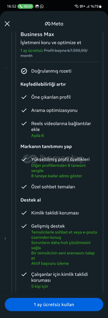 Instagram Business Max HesabıNormalde aylık ücreti 7.300 TL olan bu özel paketi, şu anda 1 ay boyunca tamamen ücretsiz olarak deneyebilirsiniz! 🎁Bu süre içinde işletmenizin Instagram performansını artırabilir, profesyonel araçların farkını doğrudan görebilirsiniz.1 aylık deneme süresi sonunda dilerseniz paketi iptal edebilir veya farklı bir planla devam edebilirsiniz.📩 Det...