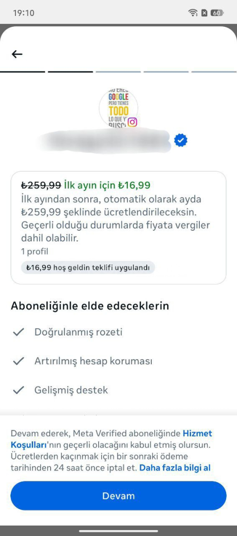 META VERIFIED için alacak kişinin, abonelik satın aldıktan sonra: (Hesapta herhangi bir değişiklik yapılmalıdır.)
