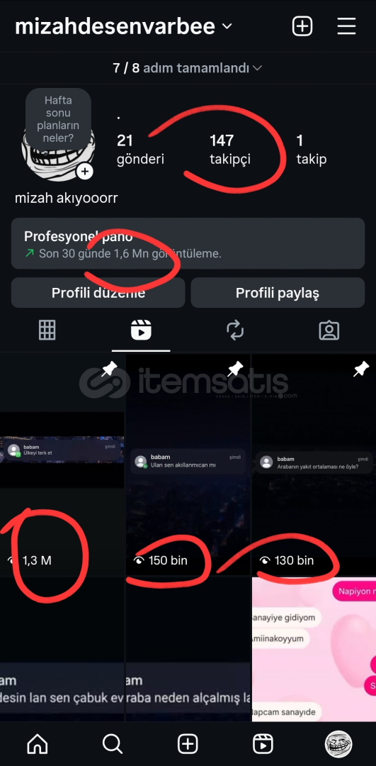 Almadan önce yazınız Hesap sorunsuzdurKesinlikle bot basılmamıstır1milyon+ izlenmesi vardır100k beğeniye sahiptir140 takipçi vardır KEŞFETİ AÇIKTIR CİDDI ALICIYA INDIRIM VARDIR